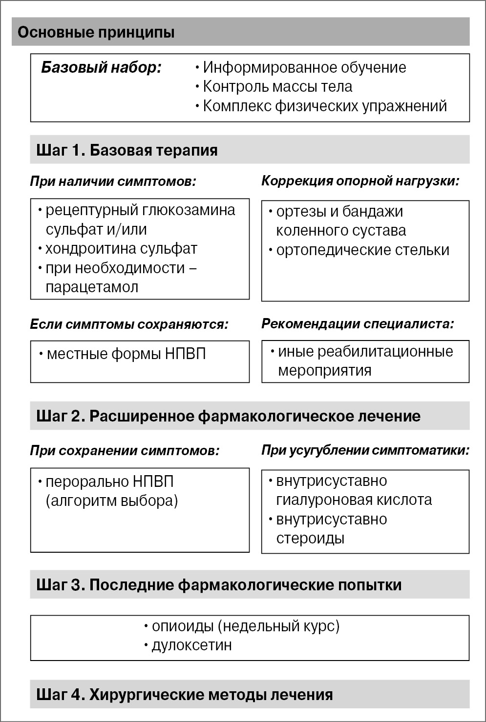 Проанализированы современные алгоритмы лечения ОА, предложенные Европейской антиревматической лигой (European League Against Rheumatism – EULAR) [15], Международным обществом по изучению остеоартрита (Osteoarthritis Research Society International – OARSI) [16], ACR и ESCEO. В случае подходов к медикаментозной терапии (назначение НПВП) ОА различной локализации (кисть, колено, бедро) специалисты как американского (ACR), так и европейского медицинского сообщества (EULAR, OARSI, ESCEO) проявляют единогласие (табл. 2, 3).