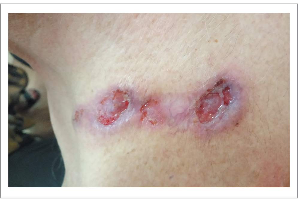 Клиническая картина ГП очень изменчива и зависит от формы и стадии заболевания [1]. У 25–50% пациентов отмечается феномен патергии – появление ГП в участках незначительных кожных травм: укол иглой, место прививки, укус насекомого (рис. 1). Места предпочтительной локализации – голени (обычно в претибиальной области) или перистомальные участки, реже туловище, голова или затылок; у детей – ягодицы, перианальная область, голова и шея [2]. В некоторых случаях параллельно с поражением кожи отмечают внекожные манифестации или нейтрофильные инфильтраты в суставах, легких (нередко), сердечной мышце, центральной нервной системе, желудочно-кишечном тракте, а также абсцессы в селезенке, печени и глазах. Возможно, в таких случаях имеют место аутовоспалительные синдромы, которые еще предстоит определить [2].