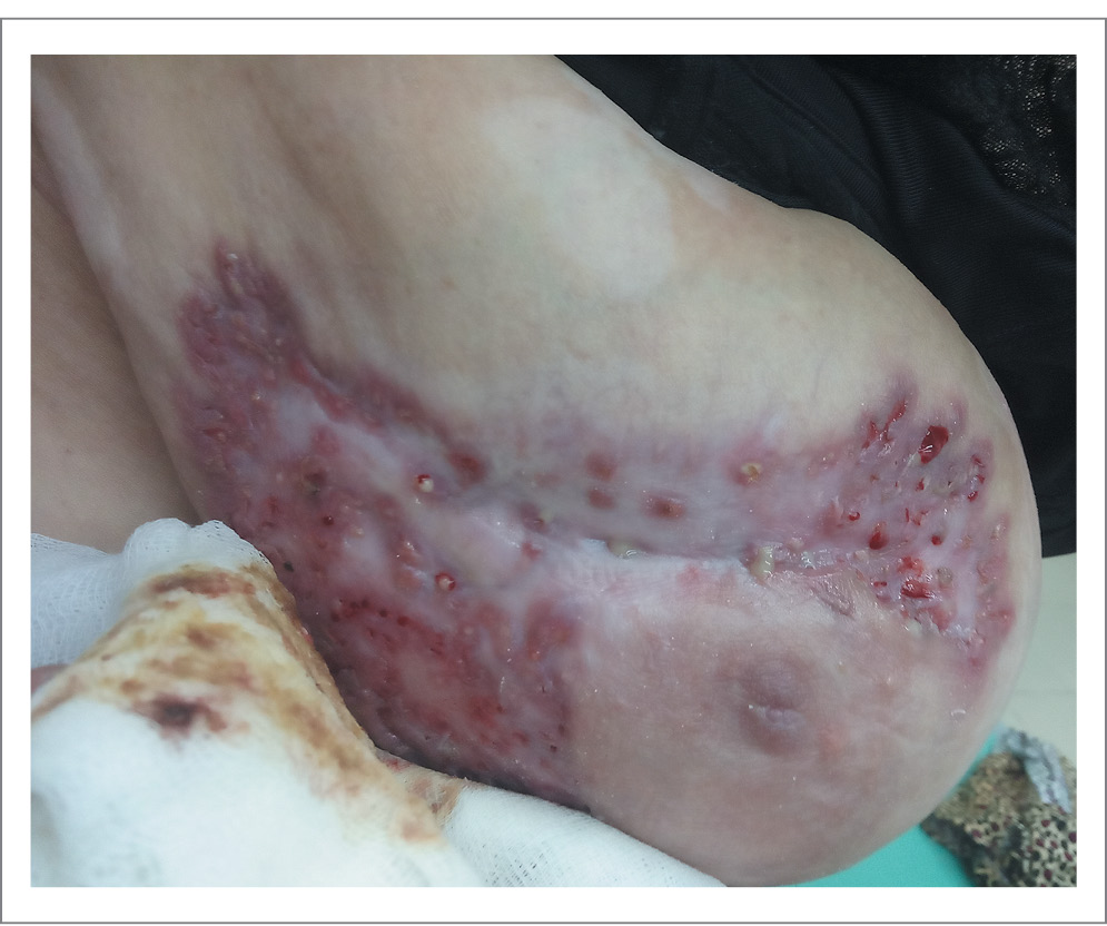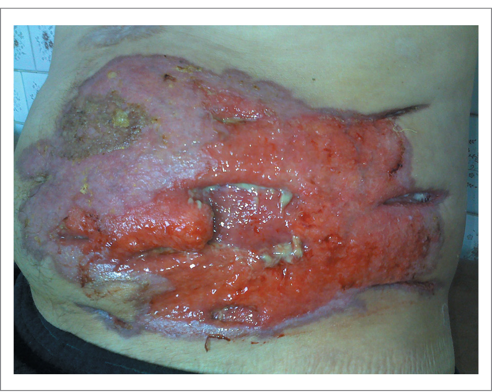 Эта форма встречается наиболее часто (рис. 2). Первым проявлением обычно является пустула или узелок-фурункул на внешне неизмененной коже (чаще всего на ногах, но иногда в месте предшествующей травмы или хирургического вмешательства). Вокруг первичного очага формируется зона эритемы, очаг постепенно увеличивается, в его центре происходит дегенерация тканей, появляются корки и эрозии, преобразующие очаг в язву. При этом усиливается субъективное ощущение боли. Края язвы синюшного оттенка, подрытые, отечные, серпигинозно распространяющиеся, дно покрыто гнойным отделяемым [2]. Возможны 2 варианта клинического течения: (1) внезапно начинающаяся и быстропрогрессирующая язва, (2) безболезненная и постепенно прогрессирующая язва. Для 1-го случая характерны внезапное начало и быстрое прогрессирование очага до тяжелого некроза. Во 2-м случае очаг прогрессирует постепенно и возможна спонтанная регрессия [4].