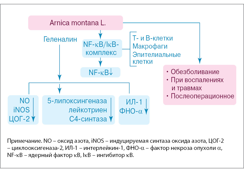 Механизмы, лежащие в основе эффективности арники горной, обусловлены входящим в ее состав геленалином. Геленалин представляет собой сесквитерпеновый лактон, является природным биофлованоидом, оказывает местное антисептическое, анальгезирующее, противовоспалительное и противоотечное действие. Геленалин опосредованно снижает содержание провоспалительных цитокинов (оксида азота, интерлейкина-2 и др.) в очаге поражения, прерывая тем самым порочный круг воспалительной реакции. Подробнее механизм действия геленалина можно рассмотреть на рис. 1 [2–4].