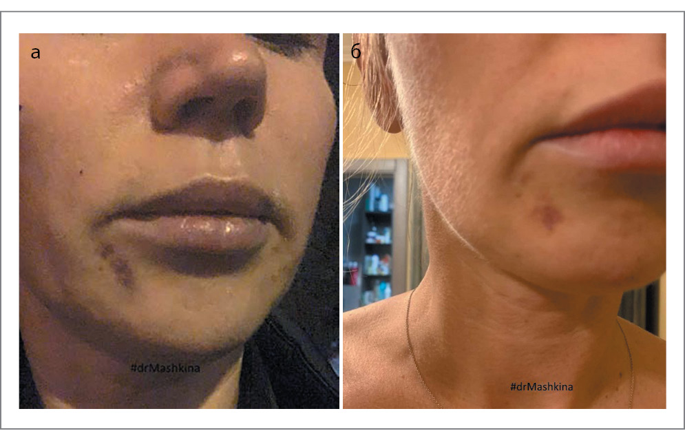 Рис. 3. Интрадермальная гематома после процедуры инъекционной контурной пластики: а – спустя 3 ч; б – на следующий день.