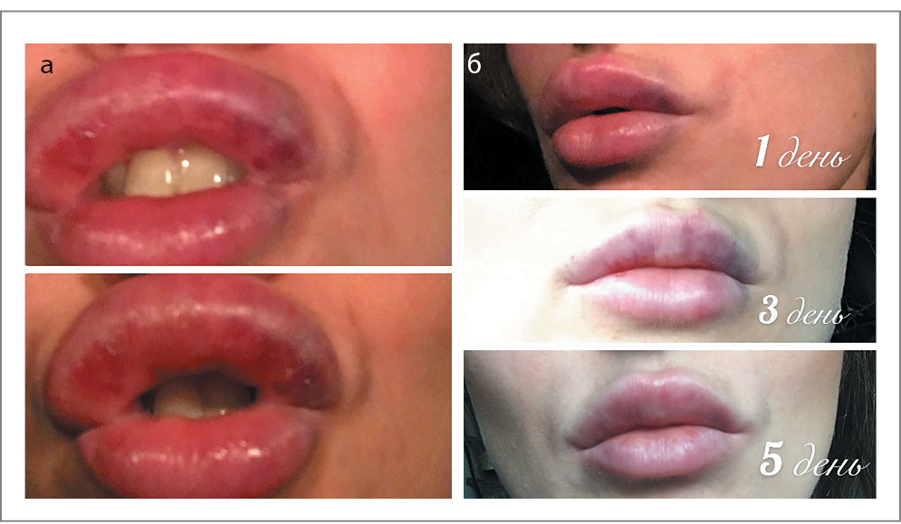 Рис. 4. Подслизистая гематома: а – после процедуры аугментации губ; б – на фоне антигематомной терапии (регресс гематомы).