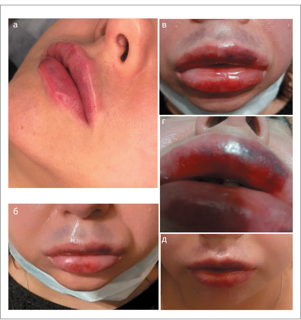 Рис. 5. Состояние тканей периоральной зоны после процедуры увеличения губ филлером: а – сразу после процедуры; б – через 5 ч; в, г – через 7 ч; д – на следующий день после процедуры и назначения системных глюкокортикостероидов.