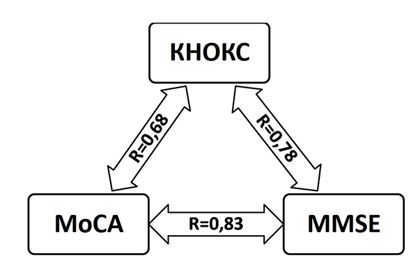 Обращает на себя внимание тот факт, что данные, полученные по MMSE, демонстрируют сильную связь (r = 0,78) с результатами применения методики с известными психометрическими характеристиками (КНОКС), а данные, полученные по MоСА, — умеренную (r = 0,68). При этом сами исследуемые методики (MMSE и МоСА) между собой тесно связаны (r = 0,83).
