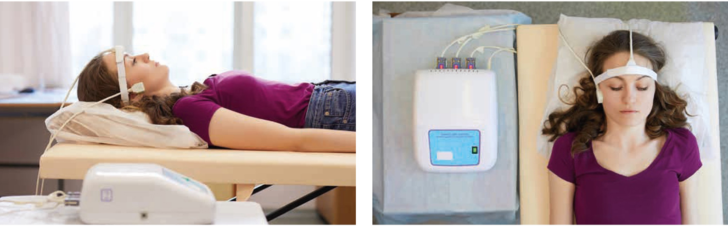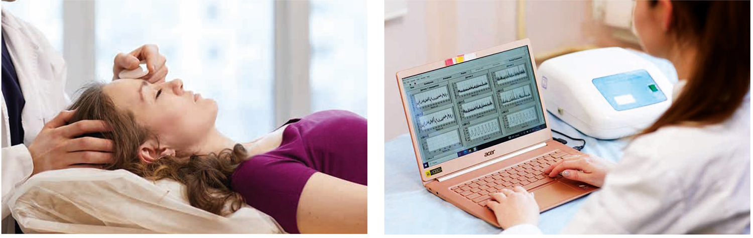 Рис. 1. Выполнение массажа гуа-ша длительностью 5 мин в лобной области (слева). Регистрация полученных данных (справа)