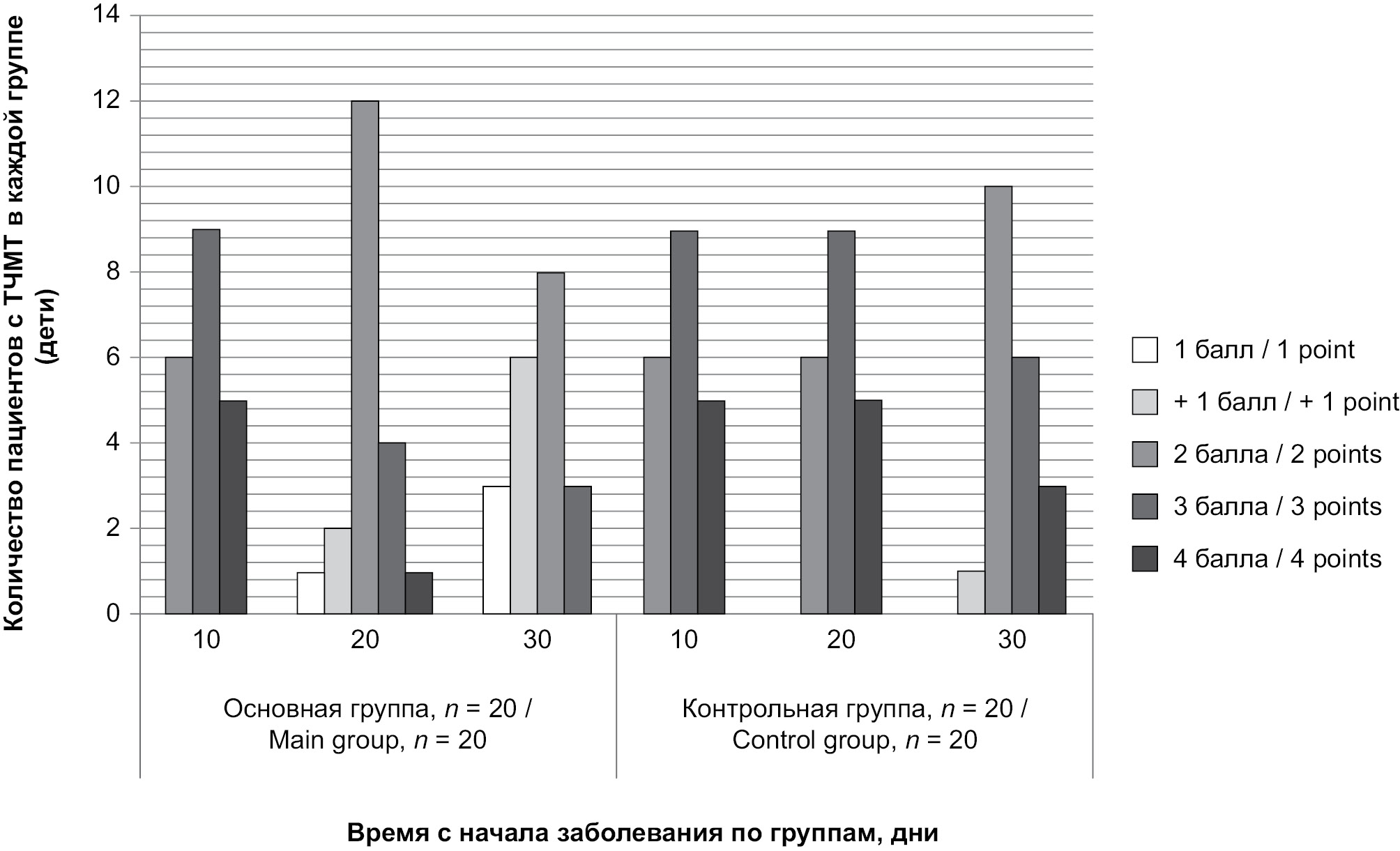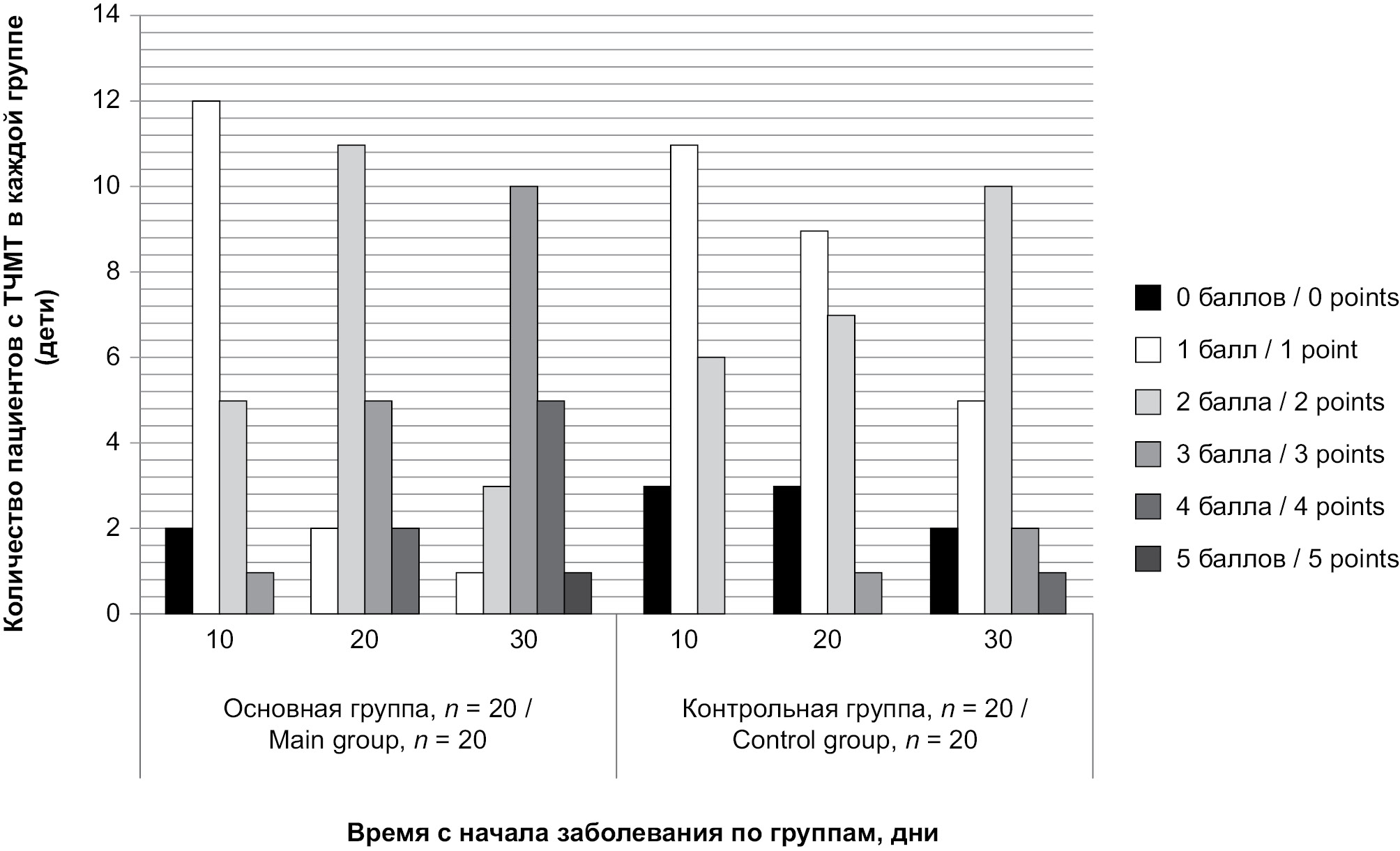По результатам исследования было зафиксировано, что мышечная сила у детей основной и контрольной групп отличалась начиная с 20-х суток после ТЧМТ. Так, в основной группе у детей выявлено более быстрое восстановление мышечной силы, чем у детей в группе контроля.
