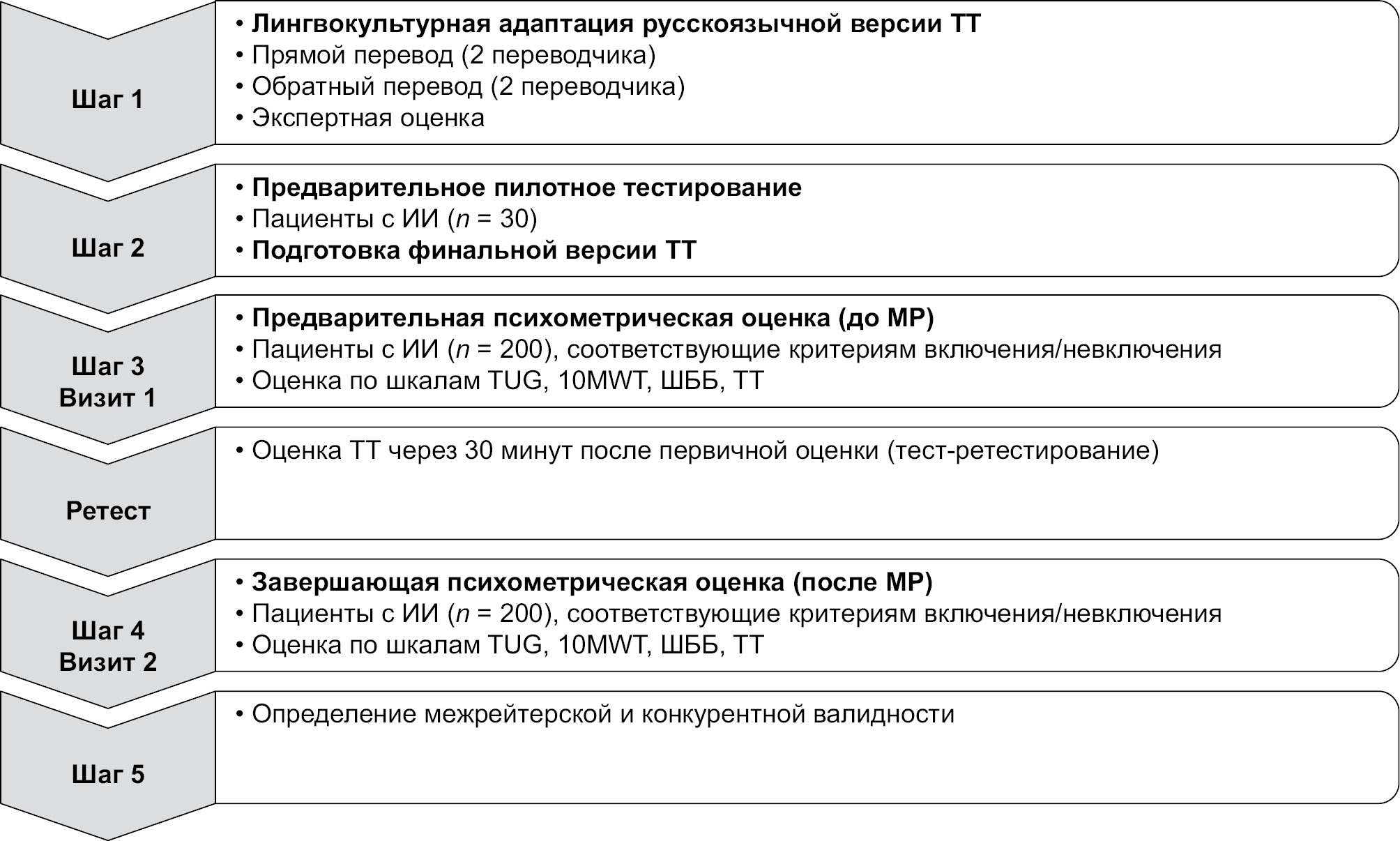 Пять специалистов по ФРМ Филиала 7 Центра с опытом работы 5 лет и более с пациентами, перенесшими ИИ, предварительно обсудили методику проведения ТТ и проводили обследования по протоколу. Пациенты оценивались на двух визитах длительностью от 45 минут до 1 часа. В 1-й день проводили TUG, 10МWT, ШББ, ТТ с промежутком в 10 минут между каждым тестом. Вторая оценка по вышеперечисленным шкалам была проведена на последнем визите, по окончании МР (2 недели). Для межрейтерского теста надежности использовали метод тест-ретестирования. ТТ оценивали дважды с 30-минутным интервалом между тестами. Дизайн исследования приведен на рис. 1.