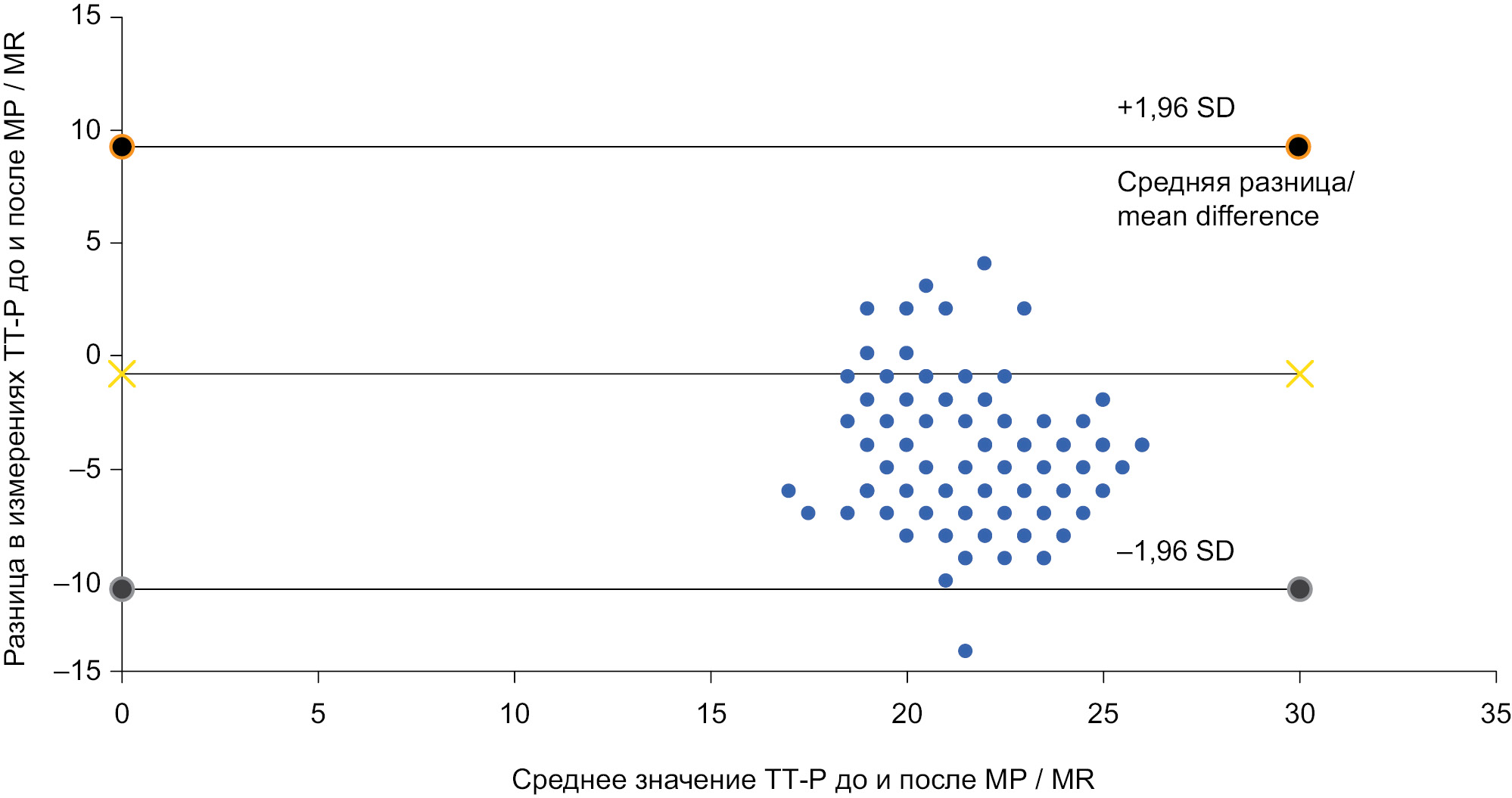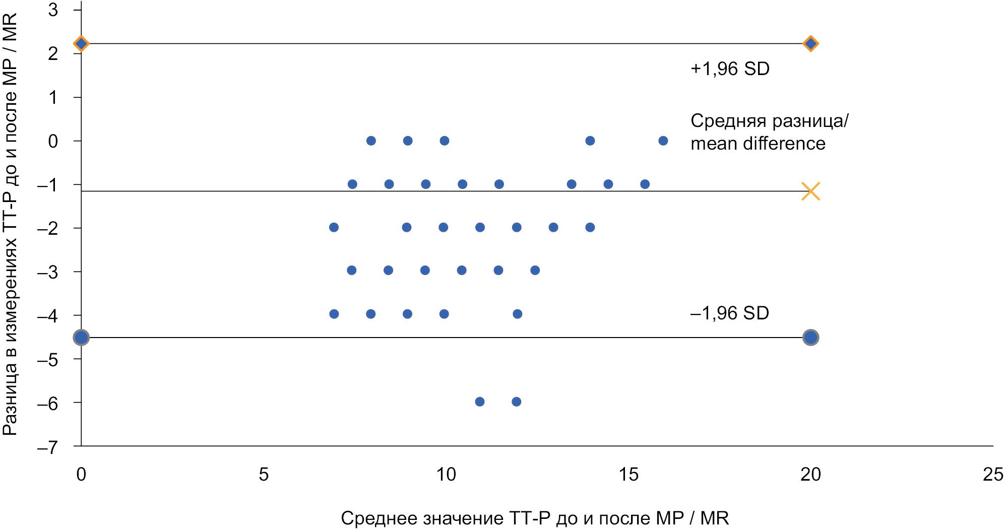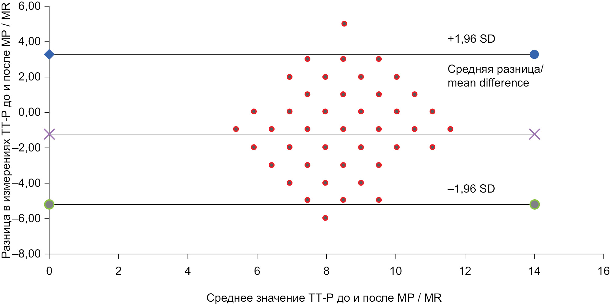 Графики Бланда — Альтмана показали, что в разделе ТТ-Р были две точки данных за пределами −1,96 SD (рис. 2); одна точка данных — за пределами +1,96 SD и одна точка данных — за пределами −1,96 SD для раздела ТТ-Х (рис. 3). Одна точка данных для общего балла ТТ находилась за пределами 95 % ДИ (рис. 4). Для определения соответствия между 1-й и 2-й оценкой была рассчитана средняя разница между измерениями, которая составила 0,20, 0,08 и 0,12 для ТТ-Р, ТТ-Х и ТТ-общ. соответственно.