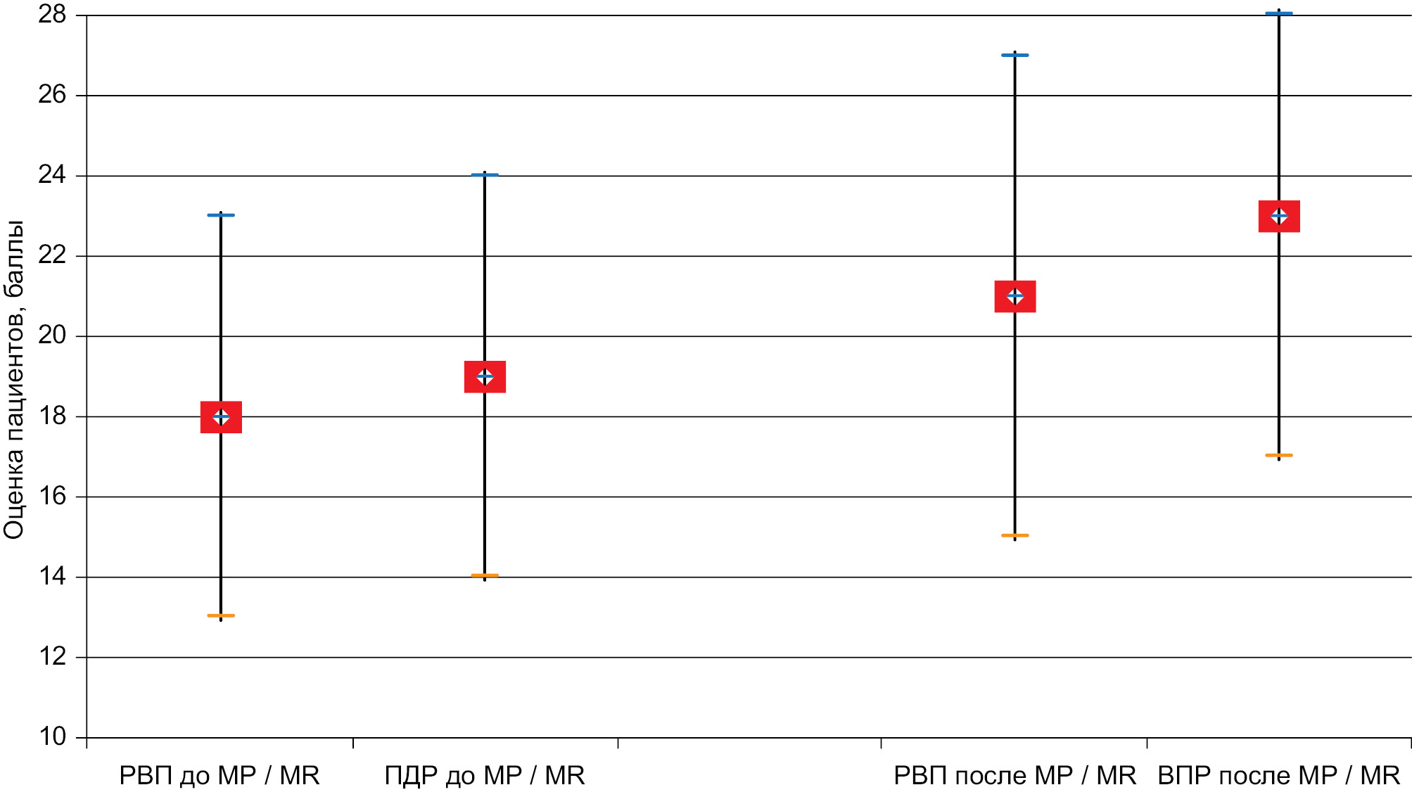 При изучении чувствительности шкалы доказан высокий уровень этого показателя. После проведения курса МР значимо выросла суммарная оценка по ТТ (ТТ-общ.): с 20,38 ± 7,6 балла при первичном обследовании в РВП и до 26,16 ± 6,5 балла (p < 0,05) и с 21,18 ± 6,9 балла в группе ПВП до 26,8 ± 5,8 балла после МР (р < 0,05). Динамика ТТ-общ. до и после МР, отражающая чувствительность шкалы, представлена на рис. 5.