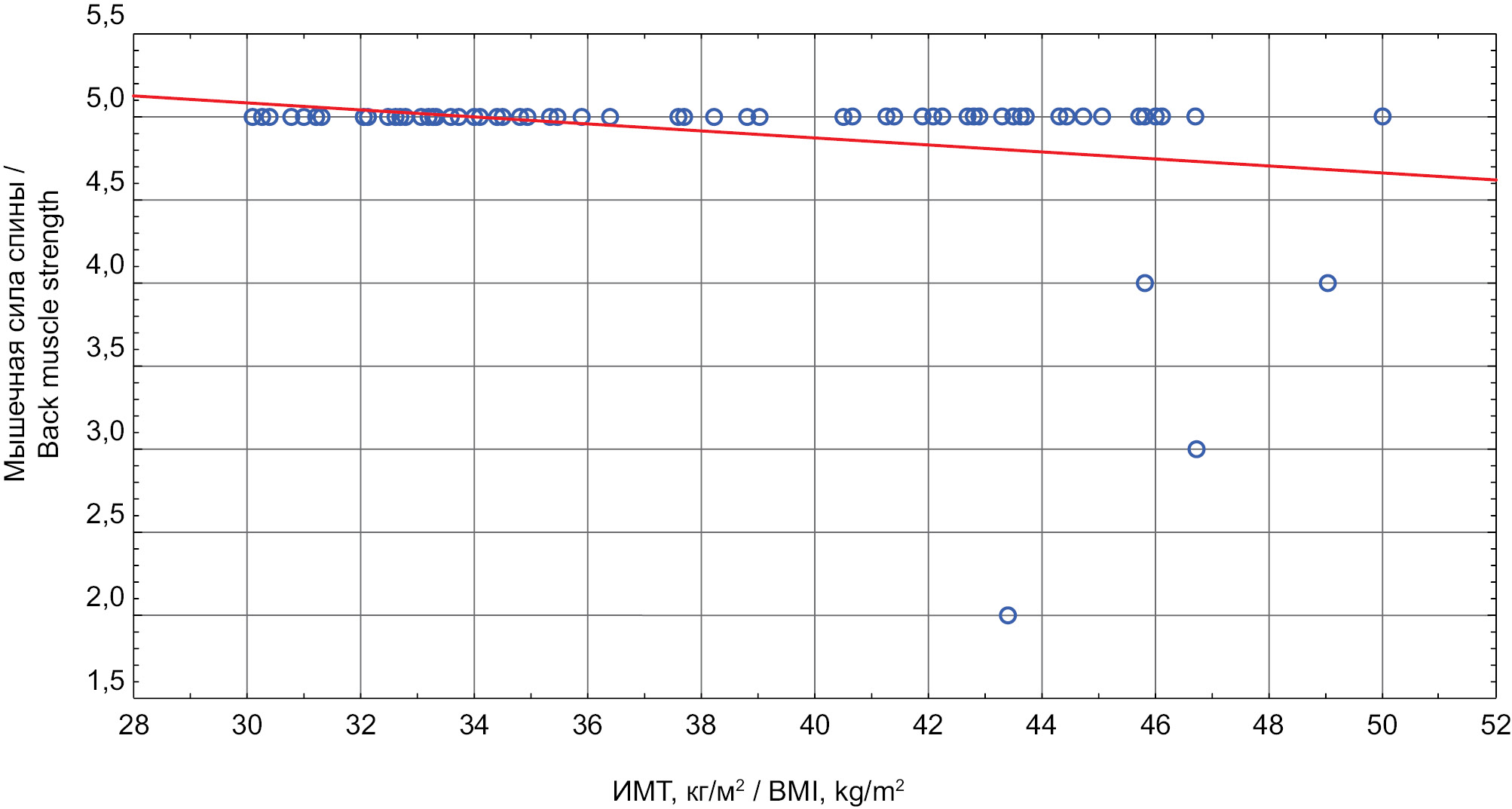 Выявлена статистически значимая прямая зависимость (гамма-корреляция, γ) между уровнем мышечной силы спины (γ = −0,81887, p = 0,003832) и массой тела. Также обнаружена достоверная связь между уровнем выносливости мышц спины к физической нагрузке и ИМТ (γ = −0,79505, p = 0,010016) (рис. 1).