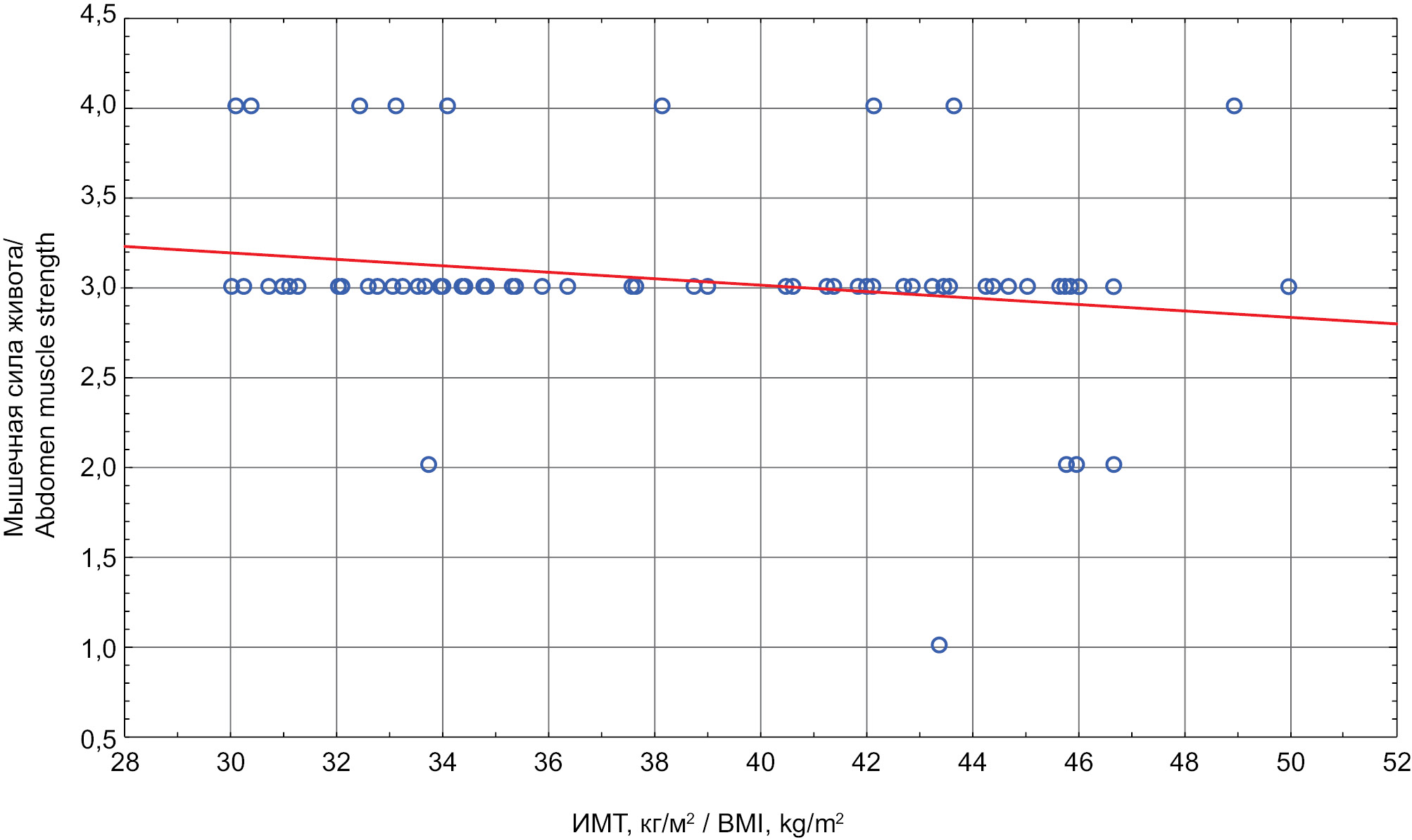 Рис. 2. Корреляционная зависимость (гамма-корреляция) между показателями мышечной силы живота и ИМТ у пациентов с ожирением