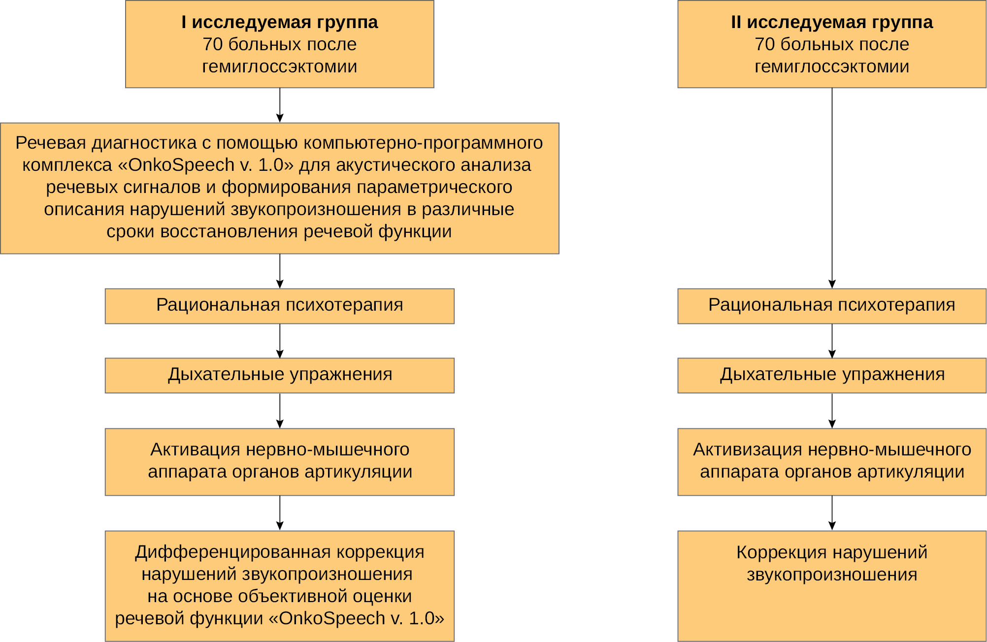 Больные распределялись по группам в зависимости от наличия первичной записи речи. Запись речи выполнялась с применением компьютерно-программного комплекса «OnkoSpeech v 1.0». Это совместная разработка социалистов Томского НИИ онкологии и лаборатории «теории распознавания и синтеза речи» Томского университета систем управления и радиоэлектроники (Томск, Россия). В I исследуемую группу мы включили 70 больных, после гемиглоссэктомии, которым до начала комбинированного лечения удалось сделать запись речи. Речевая реабилитация пациентов данной группы выполнялась по методике с применением акустического анализа речевых сигналов [7]. Во вторую группу — 70 пациентов после гемиглоссэктомии, которым не была выполнена запись речи по разным причинам. Восстановление речи выполнялась по методике без применения акустического анализа «OnkoSpeech v 1.0».