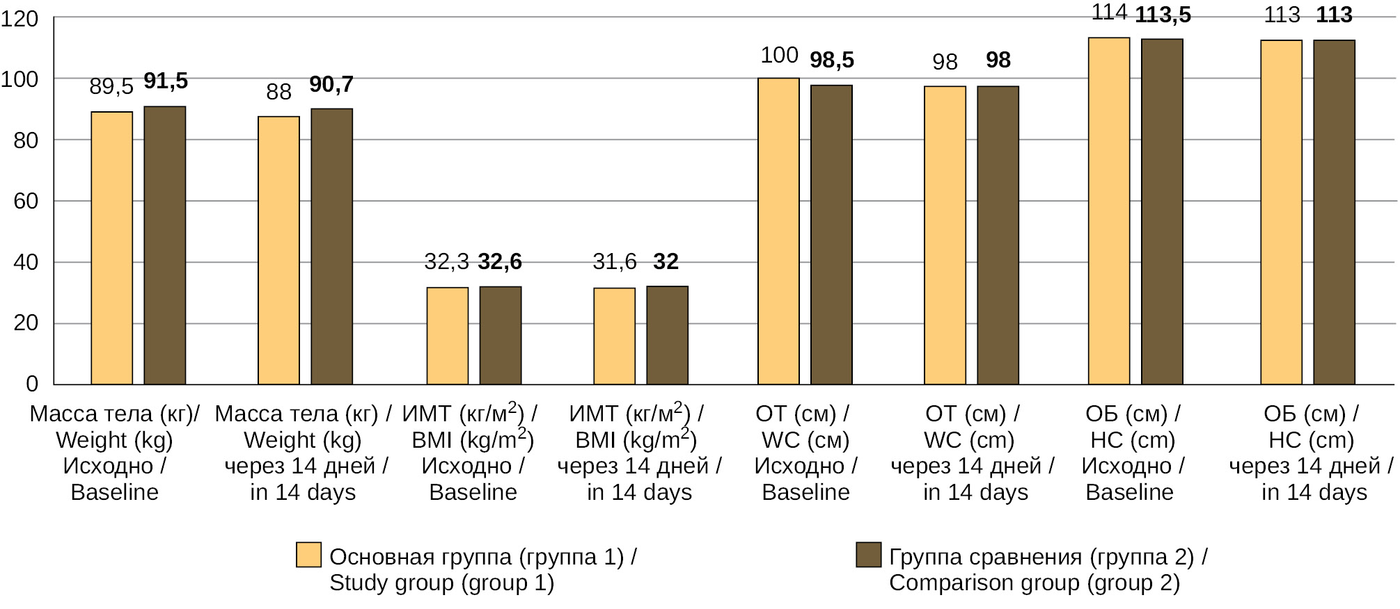 В результате анализа полученных данных, через 14 дней, сразу после завершения курса медицинской реабилитации, в основной группе значимо уменьшились средние значения массы тела с 89,5[80, 0; 101, 0] до 88,0 [78, 0; 100, 0] кг (p = 0,0002), ИМТ — с 32,3 [31, 3; 37, 5] до 31,6 [30, 6; 37, 1] кг/м2(p = 0,0003), ОБ — с 114,0 [110, 0; 130, 0] до 113,0 [108, 0; 130, 0] см (p = 0,001), ОТ — с 100,0 [94, 0; 114, 0] до 98,0 [93, 0; 113, 0] см (p = 0,0001) (рис. 1).