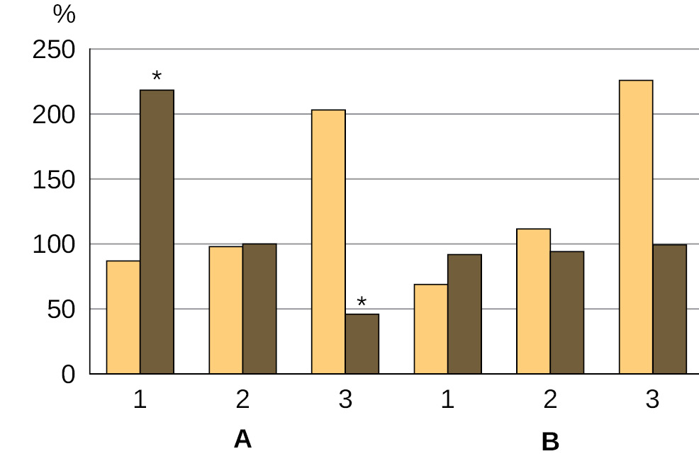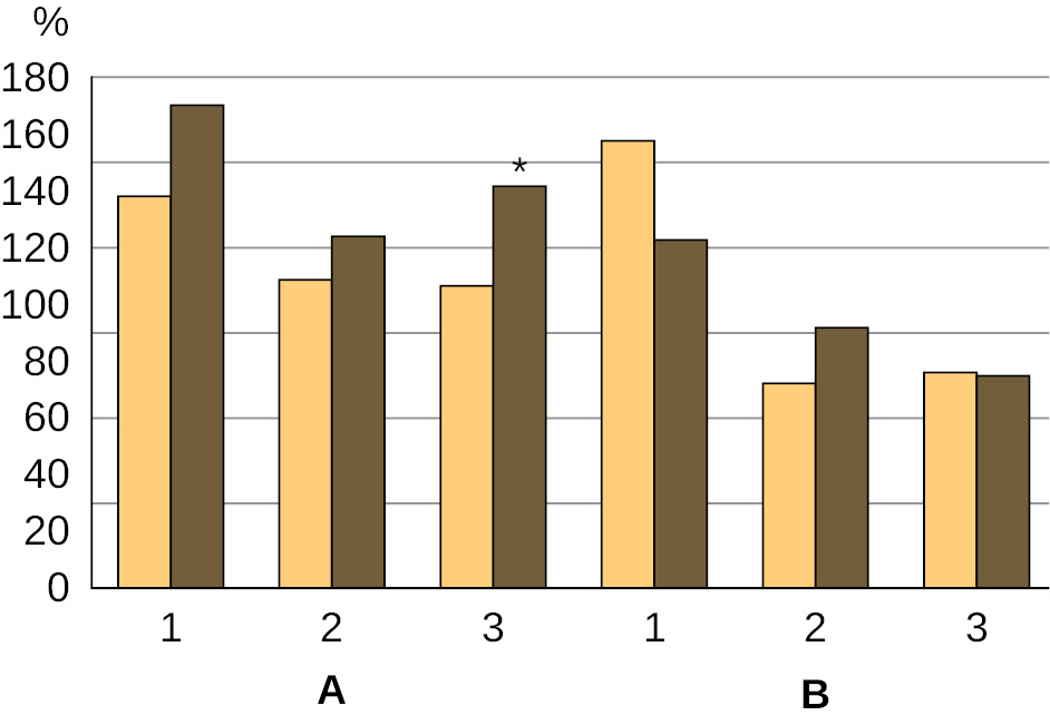 Fig. 4. Morphometric changes in mitochondria during primary prophylactic and therapeutic use of MW under stress Note: A — prevention; B — treatment; 1 — the number of mitochondria; 2 — the average area of mitochondria; 3 — the total area of mitochondria; light bars — control; dark bars — experience. * — p < 0.01 compared to the control.