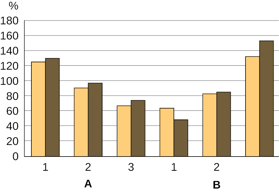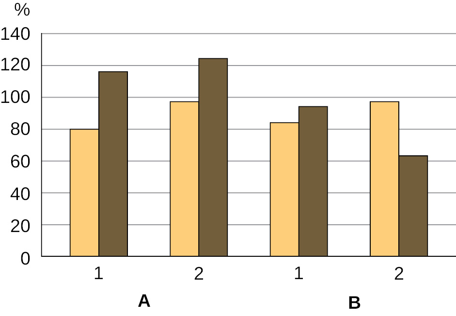 Fig. 3. Changes in the total protein content in the liver and testes during preventive and therapeutic use of MW under stress Note: A — prevention; B — treatment; 1 — liver; 2 — testes; light bars — control; dark bars — experience.
