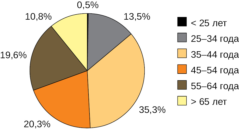 Из них прошли анкетирование полностью 713 пациентов, из них 78,8 % женщин и 21,2 % мужчин. Возрастной состав опрошенных представлен на рис. 1.