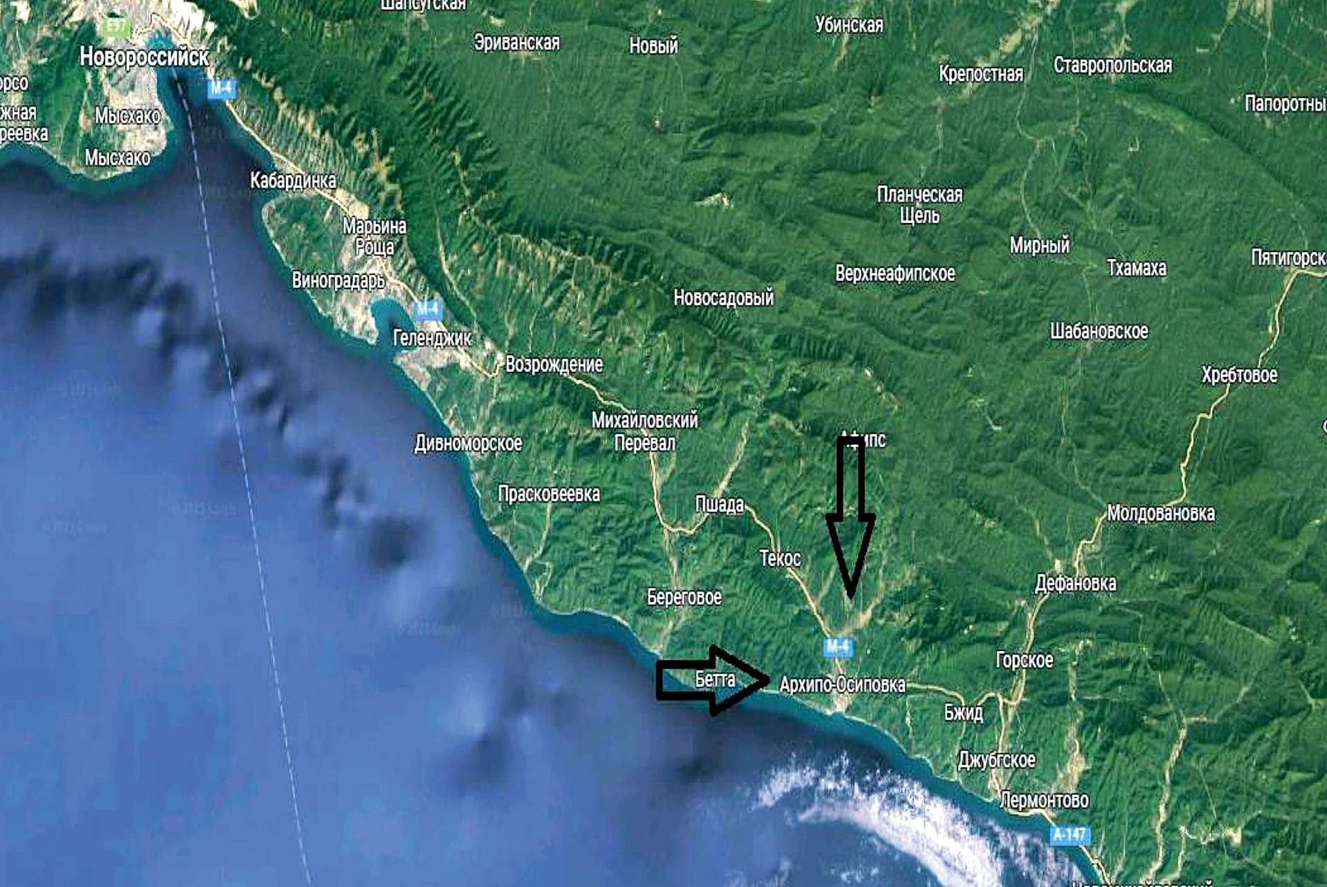 Fig. 2. The arrows on the map fragment indicate the location of the CCM “Vulan” on the territory of the village of Arkhipo-Osipovka of the Krasnodar Territory