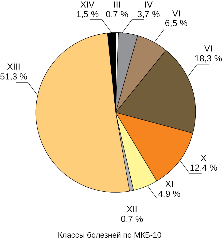 Fig. 3. The structure of morbidity in accordance with the classification of ICD-10 in patients of CCM “Vulan“, % Note: Classes of diseases according to ICD-10: III — blood diseases; IV — diseases of the endocrine system; VI — diseases of the nervous system; XI — diseases of the circulatory system; X — diseases of the respiratory system; XI — diseases of the digestive system; XII — diseases of the skin and subcutaneous tissue; XIII — diseases of the musculoskeletal system and connective tissue; XIV — diseases of the genitourinary system.