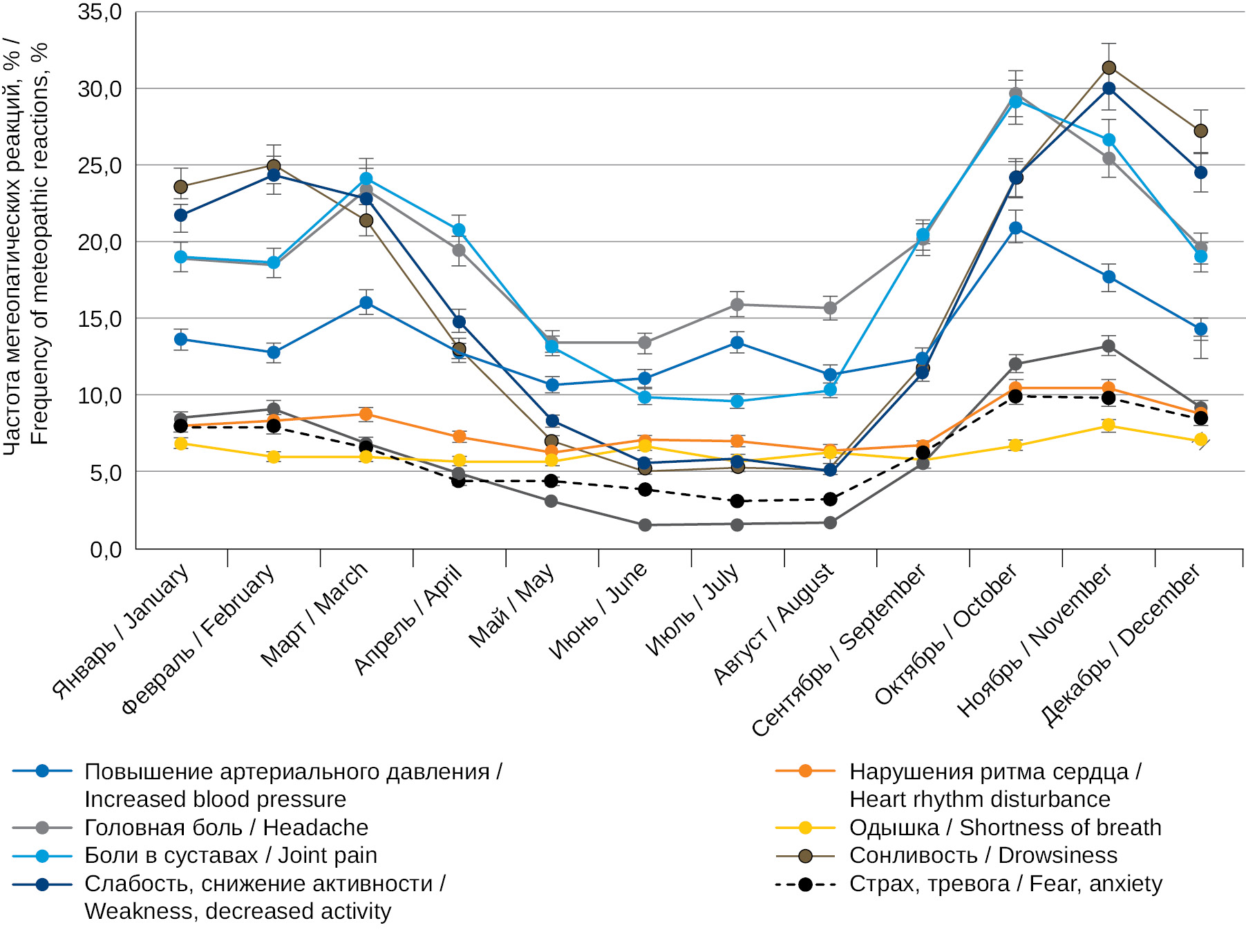 РЕЗУЛЬТАТЫ. Выявлено, что наибольшая частота зафиксированного повышения артериального давления отмечается в марте, октябре, ноябре и декабре, наименьшая регистрируется в мае, июне и августе. В то же время частоты других метеопатических реакций, таких как страх, тревога, одышка и другие, распределены одинаково в течение года.
