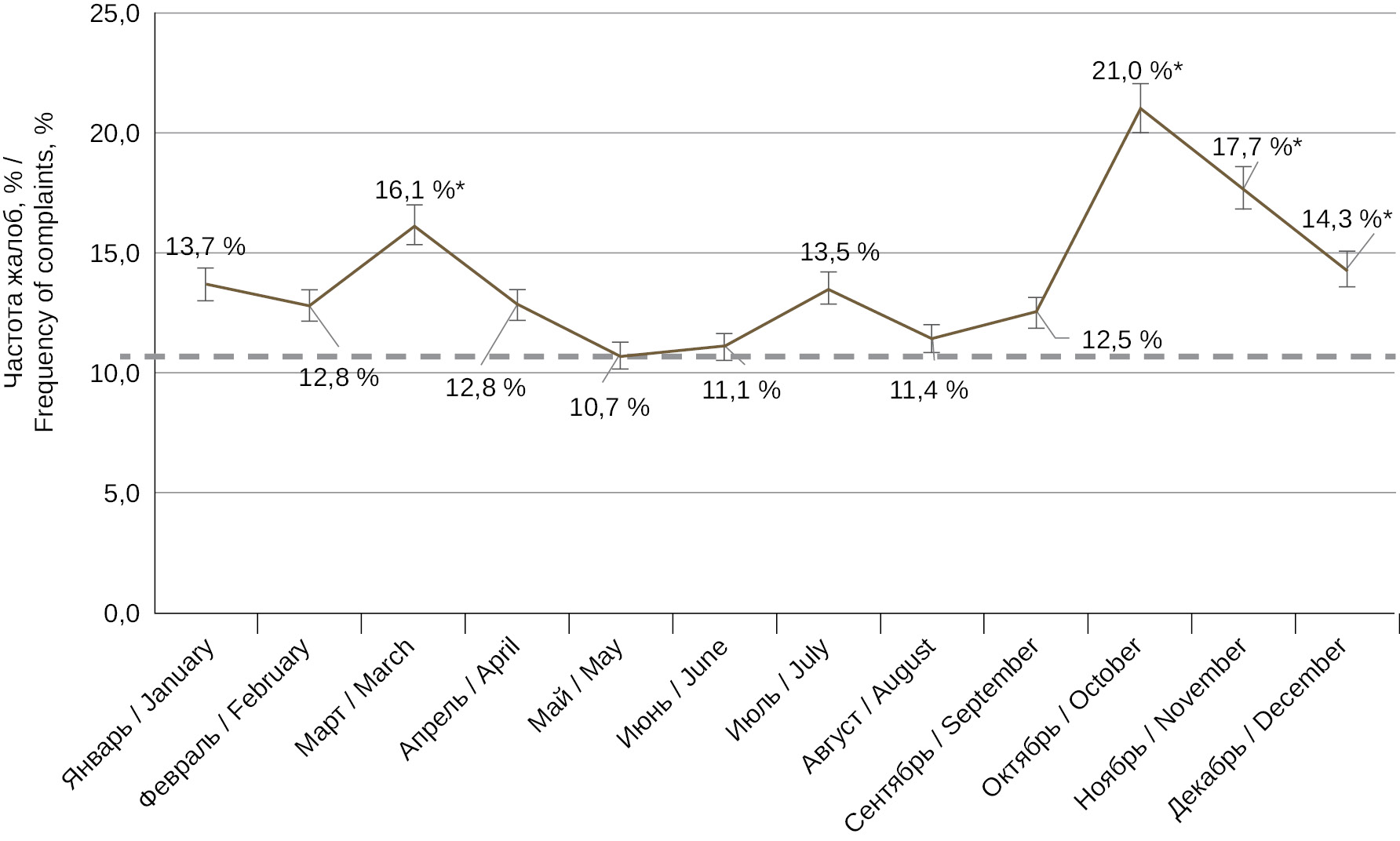 Рис. 5. Частота жалоб пациентов СКК «Вулан» на повышенное артериальное давление в различные месяцы года по данным опроса, % Примечание: * — p <0,05, оценка различий проведена по критерию χ2