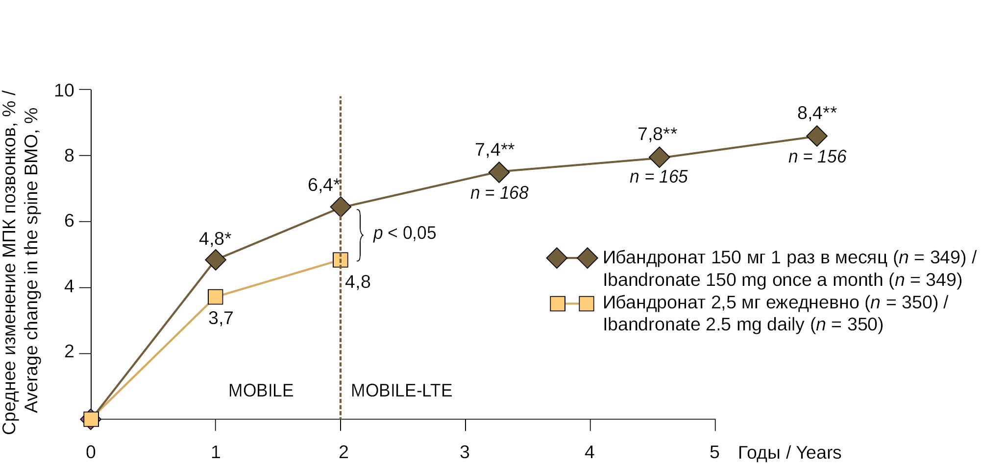 В целом в исследовании MOBILE было продемонстрировано, что дозировка ибандроновой кислоты 150 мг для ежемесячного приема значительно превосходит по эффективности ежедневную пероральную форму ибандроната 2,5 мг по степени прироста МПК в позвоночнике [46, 47].