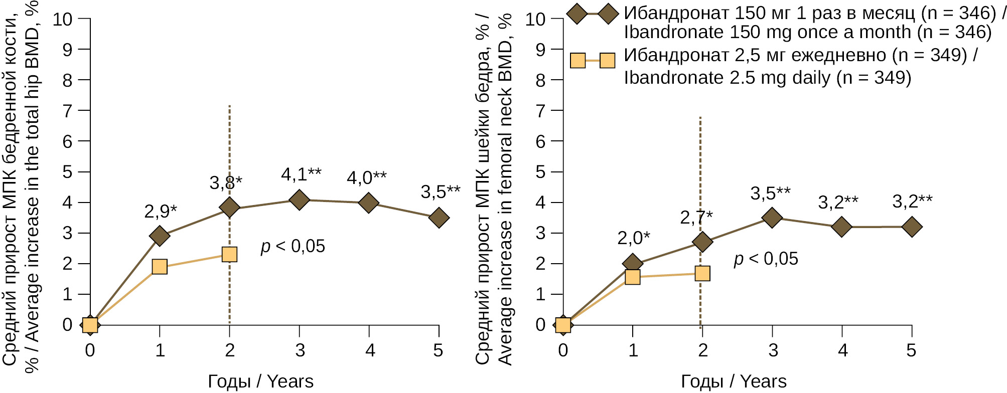 Рис. 2. Влияние 5-летнего перорального приема ибандроновой кислоты в дозе 150 мг 1 раз в месяц на МПК бедренной кости у женщин с постменопаузальным остеопорозом (адаптировано из Miller P.D. et al., 2005, 2012 [45, 46]) Примечание: Приведен ITT-анализ исследования MOBILE-LTE; * — p < 0,05 в сравнении с исходным уровнем; ** — 95 % ДИ по сравнению с уровнем через 2 года лечения.