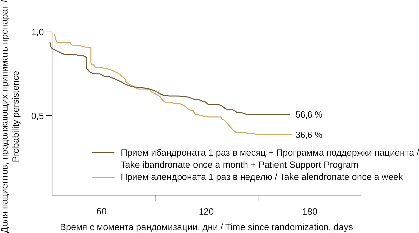 Урежение кратности дозирования пероральной формы ибандроната 150 мг до 1 раза в месяц и улучшение переносимости со стороны верхних отделов ЖКТ способствовали значительному повышению приверженности терапии пациентов с ПМО при приеме ибандроната по сравнению с БФ, принимаемыми еженедельно. Исследование PERSIST продемонстрировало, что упорство в лечении было значительно выше у пациентов, получавших ибандронат 1 раз в месяц по сравнению с принимавшими алендронат 1 раз в неделю — 56,6 % (306/541) и 38,6 % (198/513) соответственно (p < 0,0001). То есть по сравнению с алендронатом при лечении ибандронатом наблюдается увеличение доли пациентов, продолжающих лечение, на 47 % (рис. 3). Доля пациентов, продолжающих лечение в конце исследования и пациентов, выбывших из исследования, также значительно отличались в пользу ибандроната [51].