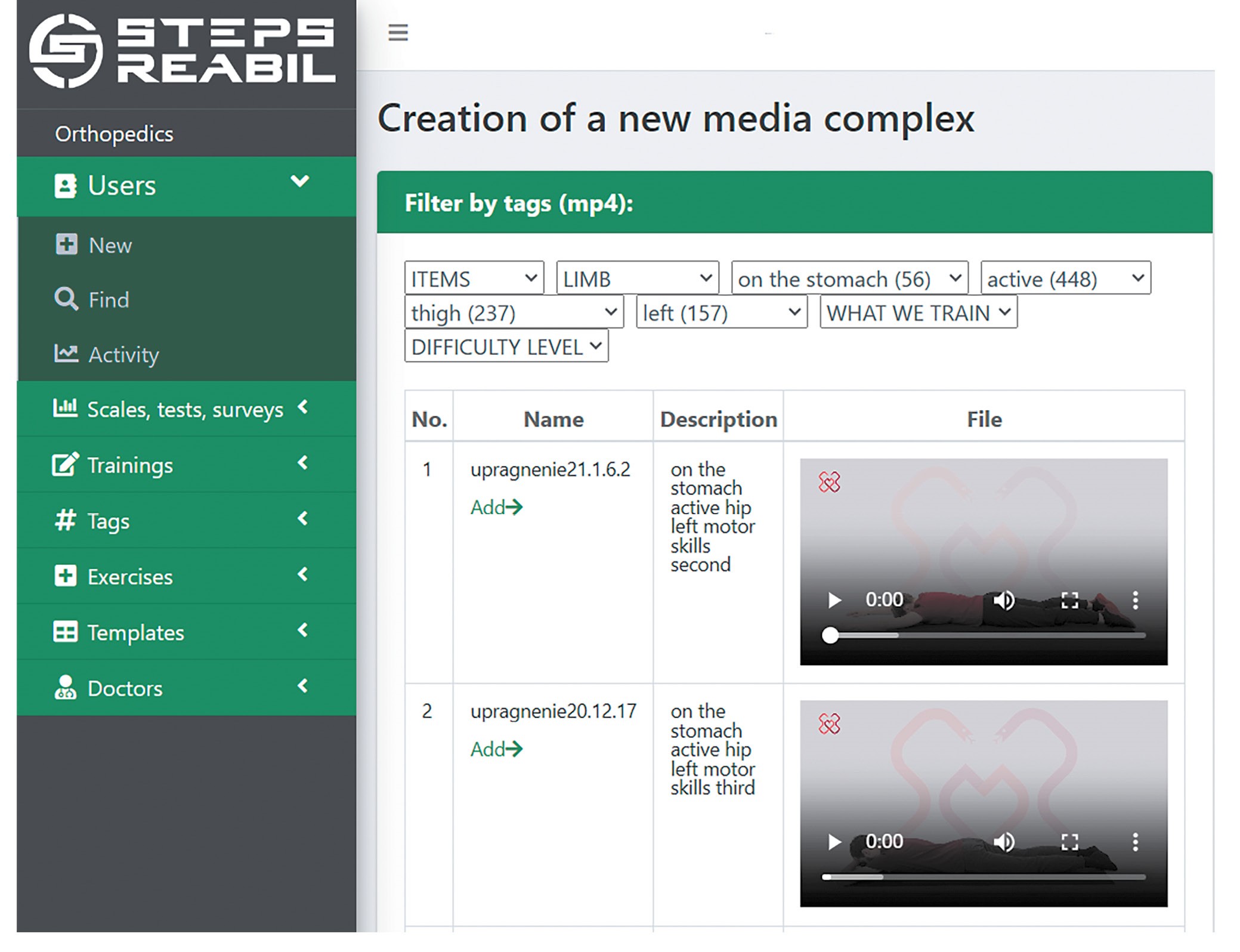 Under the agreement between FSBEI HE «Privolzhsky Research Medical University» of the Ministry of Health of Russia and «Digital Technologies Centre» LLC on the basis of «STEPS REABIL» platform a block/module «Orthopaedics» (https://pimunn.stepsreabil.com/) was created, which contains 522 video clips with demonstration of physical exercises used at different stages of MR of patients after hip or knee replacement, as well as a set of evaluation tools to monitor the effectiveness of MR. The posted videos were filmed and edited by specialists of «Privolzhsky Research Medical University», who have many years of experience in physical rehabilitation of patients who have undergone hip or knee replacement. The physical exercises presented in the video library have different levels of difficulty and are aimed at restoring muscle strength of key muscles, balance training, prevention of contractures, restoration of normal walking pattern, improvement of functional mobility of patients. Video clips were «tagged», i.e. each video clip with demonstration of a particular physical exercise was assigned keywords, according to which the specialist selects exercises for a particular patient. The video library is tagged by the position in which the exercise is performed (on the back, stomach, on the side, palm-knee, etc.), by the body part involved (hip, knee, buttock, leg, etc.), by the training focus (coordination, walking, motor skills, etc.), by the level of difficulty and aspect, and by the gymnastic equipment used (block, wand, elastic strap, ball, Swedish wall, etc.) (Figure 1). When creating a set of videos for a particular patient, the «Steps Reabil» portal allows you to specify the number of repetitions, the duration of the exercise and the purpose of the exercise.