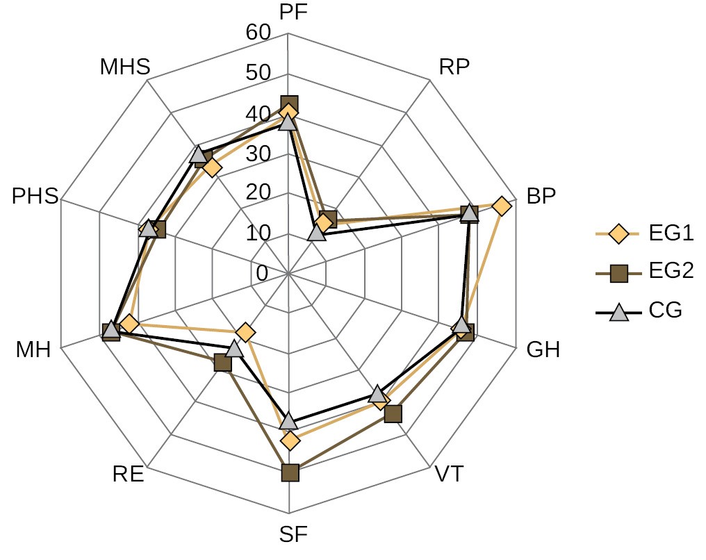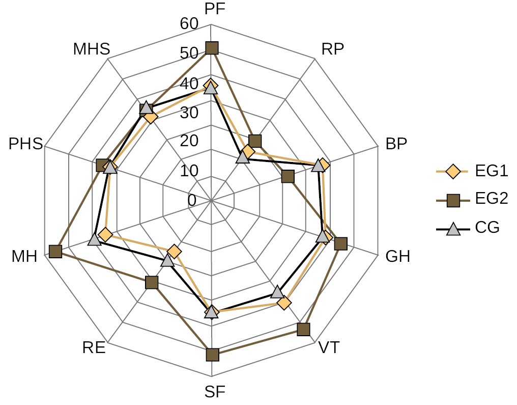 The study participated 42 patients, 28 men (66.6 %) and 14 women (33.4 %). The study included patients whose stroke occurred from 2 weeks to 1 month ago — 5 people (11.9 %), patients whose stroke history ranged from 1 to 3 months — 33 people (78.5 %), and patients with stroke history from 4 to 6 months — 4 people (9.6 %). From the point of view of restoring the functions and tasks of rehabilitation (A.S. Kadykov), the patients whose time after a stroke ranges from 2–3 weeks to 6 months belong to the early recovery period. The age of the tested persons varied from 25 to 80 years. The most numerous occurred the age group from 51 to 60 years — 13 people (30.9 %) and the age group from 61 to 70 years — 12 people (28.5 %). 46.0 % of them were the active working age. Only men were the patients in the age group of 25–40 and 71–80 years. Such risk factors as smoking and alcohol overuse were observed in 23 people (54.7 %) and 13 people (30.9 %) correspondingly. The arterial hypertension was observed in 22 people (52.3 %), atherosclerosis — in 25 people (59.5 %), the combination of arterial hypertension and atherosclerosis was observed in 18 people (42.8 %), discirculatory encephalopathy was observed in 17 patients (40.4 %), ciliary arrhythmia — in 14 patients (33.3 %), ischemic heart disease — in 21 people (50.0 %), chronic cardiac insufficiency in 12 patients (28.5 %) and diabetes mellitus in 6 patients (14.2 %). The concomitant diseases (pneumonia, urinary tract infections, and thrombophlebitis) were observed in 17 patients (40.4 %). 12 (28.5 %) people suffered from obesity, the stressful situation during 6 months before the stroke was observed in 24 (57.1 %) people, and the low physical activity was in 29 people (69.0 %). Thus, modifiable risk factors such as smoking, alcohol consumption, low physical activity and hypertension played a significant role. At the same time patients had from 2 to 4 risk factors. The movement disorders, balance disorders, postural balance disorders observed before the start of the complex physical rehabilitation at the outcome analysis of the initial examination of the patients after the stroke according to different tests. All the patients had the problems with self-care and mobility and required outside help; all of them had the reduced indicators of quality of life. The developed comprehensive physical rehabilitation program using unstable balancing platforms and training on stabiloplatform to a greater extent than the traditional therapeutic physical culture program provided for neurological patients contributed to increasing the degree of independence, self-care and mobility in everyday life, reducing the level of personal and situational anxiety, improving the psycho-emotional status of patients [13, 14]. The study made it possible to prove positive changes: according to Berg Balance Scale in CG the indicators increased by 19.2 % (from 35.5 to 42.3 points), in EG1 — by 26.2 % (from 35.5 to 44.8 points) and in EG2 — by 29.6 % (from 36.1 to 46.8 points). According to the results of the Bartel Index, the increase in the level of household activity related to the self-service sector: in CG by 15.8 % (from 61.5 to 71.2 points), in EG1 by 18.6 % (from 62.2 to 73.8 points) and in EG2 by 26.9 % (from 62.1 to 78.8 points). There was a significant (p < 0.05) improvement of the balance and walking parameters, estimated according to the Tinneti scale, that reduced the risk of falling of the patients in EG2 by 41.0 % (in CG by 24.0 %, in EG by 27.0 %). When the balancing platforms and trainings on the force plate are included into the programme of the physical rehabilitation, reliable improvement of the locomotor function indicator (р < 0.05) compared with the initial values in the all groups according to the Time Walking Test of the speed indicators of walking and covered distance. The positive impact of the programme of the physical rehabilitation with the use of the balancing platforms and training on the force plate upon the increasing of the independence degree was observed, and consequently the improvement of the quality of life was observed in EG2, where the PF indicator achieved 61.1 points. The higher values according to the subscales VT (62.7 points) and MH (65.7 points), SF (61.1 points) out of maximum 100 were also registered in this group (Figure 1, 2). The RP indicator, objectifying the degree of physical well-being influence upon the daily life, increased during the treatment process, at the same time remaining at rather low level (29.5 points). The less significant improvement was revealed according to the subscales, forming the psychological component of the quality of life. The significant (p < 0.05) decrease of the personal (by 30.35 %) and state (by 25.6 %) anxiety among the patients of EG2 was found, characterizing the increase of the activity and motivation of the patients to work and responsibility in solving their health problems. The analysis of the indicators of the stabilometrical research demonstrated positive changes in the balance of the verticalis standing and walking.