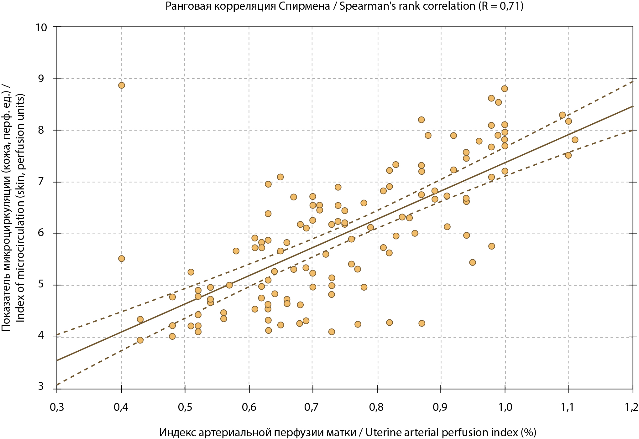 Fig. 3. Correlation (Spearman’s rank correlation) between the index of arterial perfusion of the uterus and the index of general microcirculation in the skin of the suprapubic region
