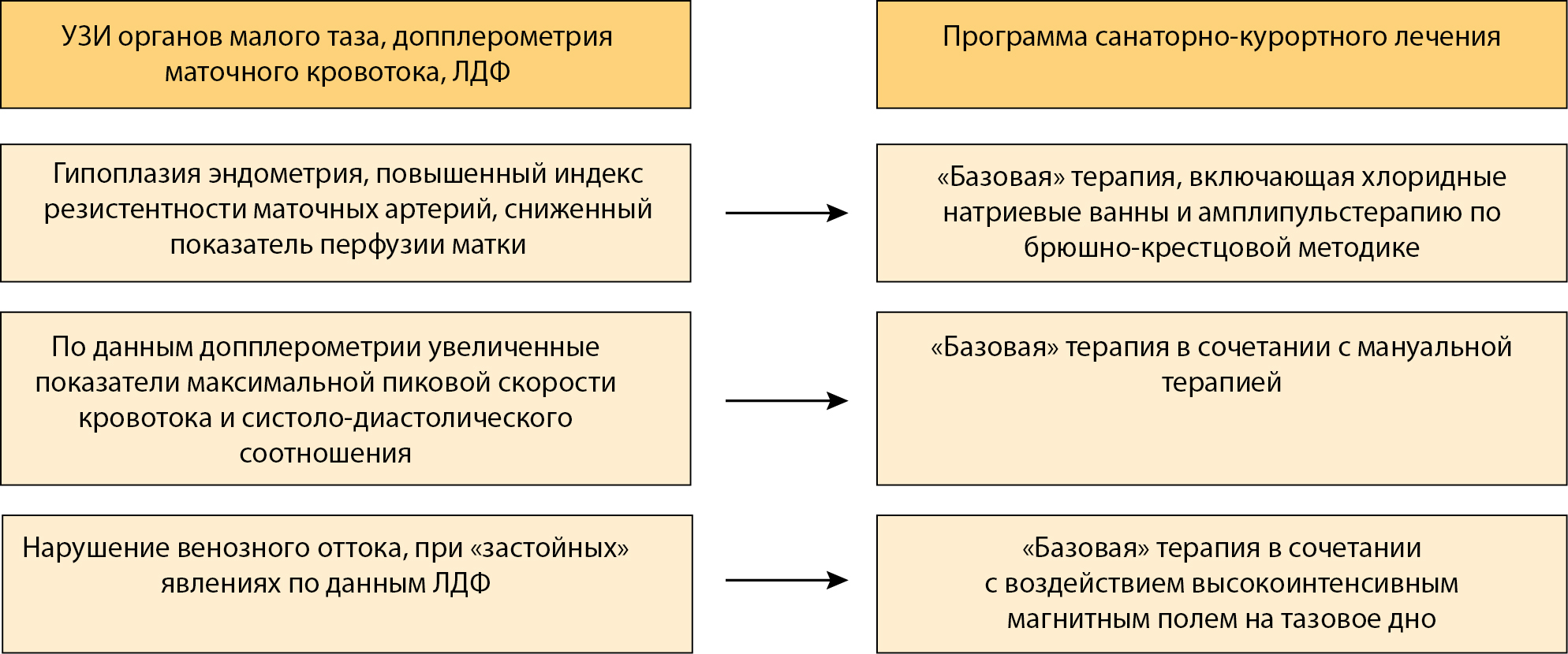 CONCLUSION. An algorithm has been developed. In case of endometrial hypoplasia, decreased uterine perfusion, increased uterine artery resistance index, «basic» therapy is recommended, including sodium chloride baths and amplipulstherapy. With an increase in the maximum peak blood flow rate, an increase in the systolic-diastolic ratio, it is necessary to add a course of manual therapy to the «basic» therapy. When detecting violations of venous outflow, it is recommended to include high-intensity pulsed magnetic therapy.