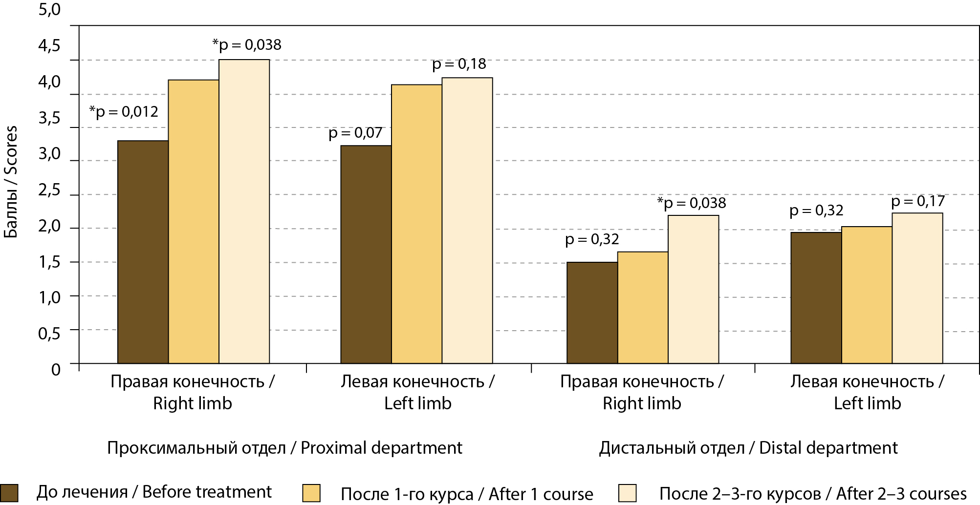 Fig. 1. Assessment of upper limb muscle strength (in points) in patients with long-term consequences of cervical spine injury before and after comprehensive rehabilitation