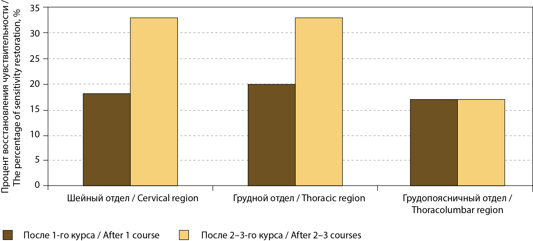 Клинический анализ изменений чувствительности производился отдельно, в зависимости от уровня повреждений. В среднем с учетом всех уровней повреждения снижение уровня нарушений чувствительности после 1-го и 2–3-го курсов реабилитации достоверно не отличалось и составило соответственно 2 [1; 4] и 2 [1; 3] дерматома (p = 0,620). Процент восстановления чувствительности составлял 19 [17; 33] % (рис. 2).