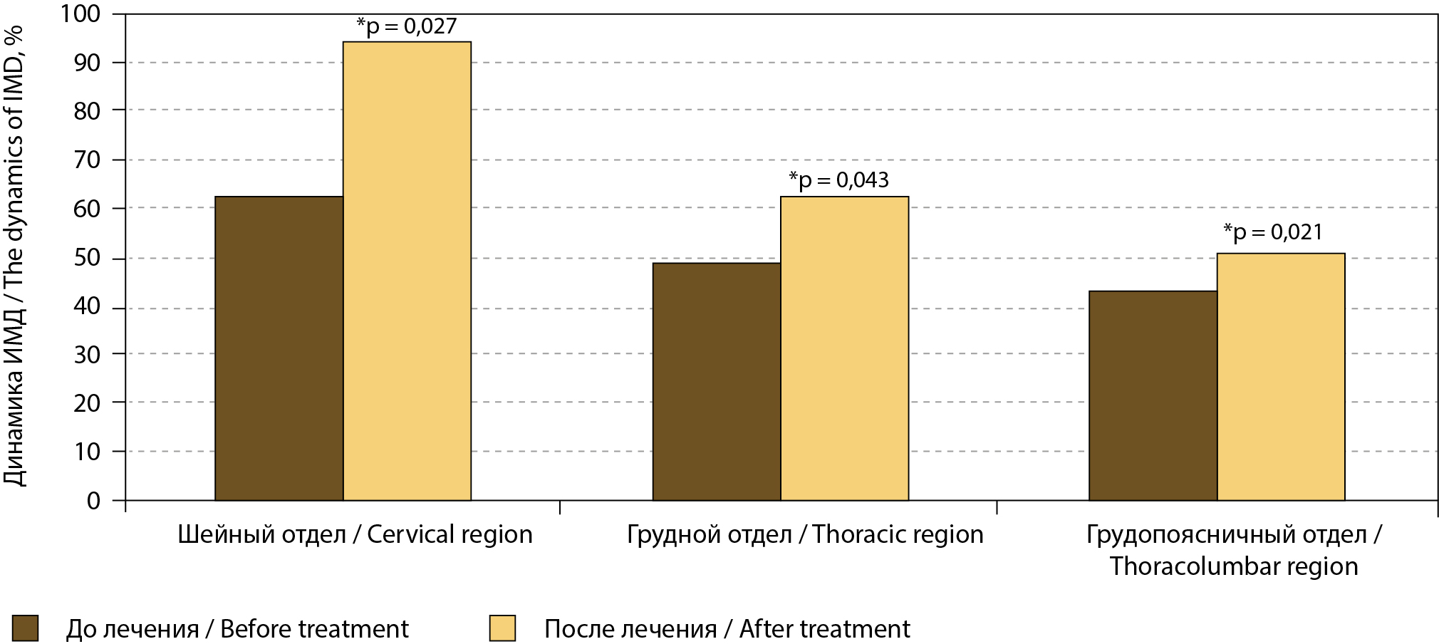Грудопоясничный oтдел / Thoracolumbar region (n = 9) | 42,5 | 62,0 p = 0,068 | 40,0 | [39; 40] | 65,0 *p = 0,006 | [63; 65] | ||