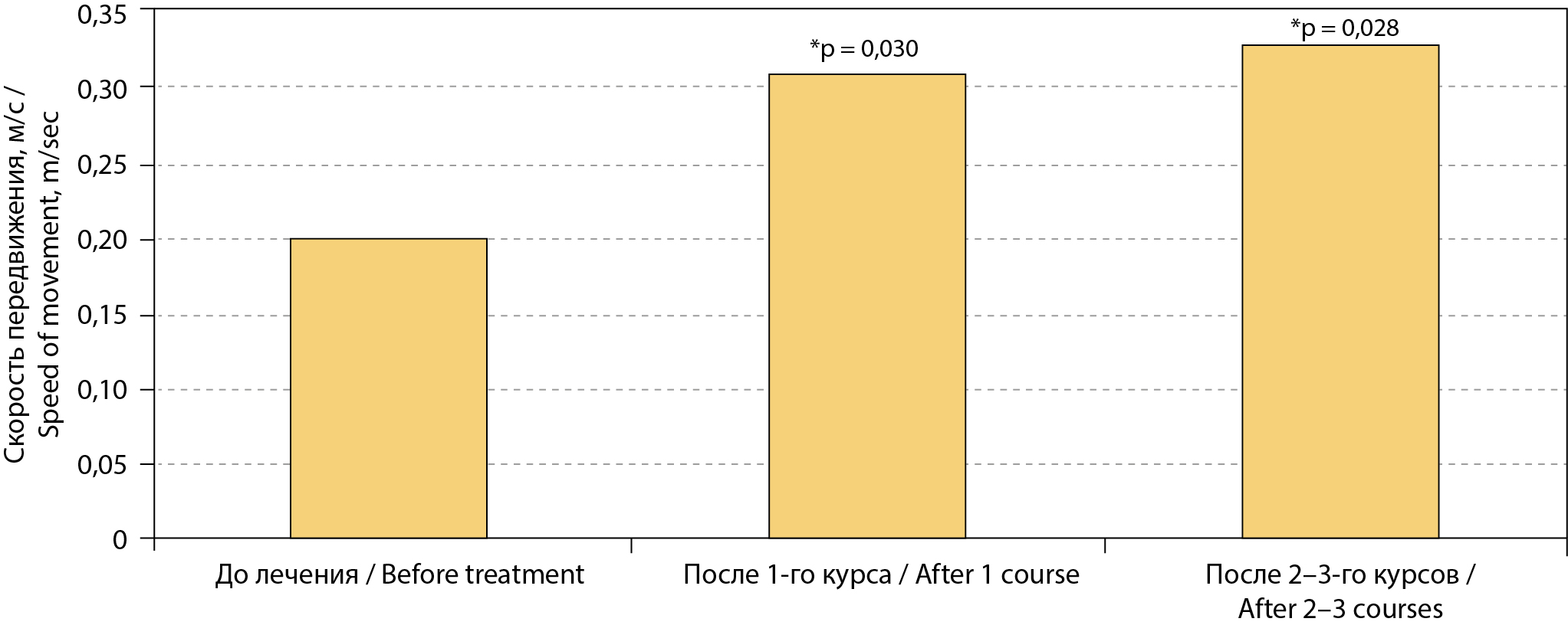 Двигательную функцию исследовали с помощью 10-метрового Walk-теста. Пациенты ходили со вспомогательными средствами опоры (ходунки) с предпочтительной скоростью ходьбы по 10-метровой дорожке без какого-либо перерыва до конечной точки. Определялось время на промежуточных 6 м. Рассчитывалась скорость ходьбы (м/с).