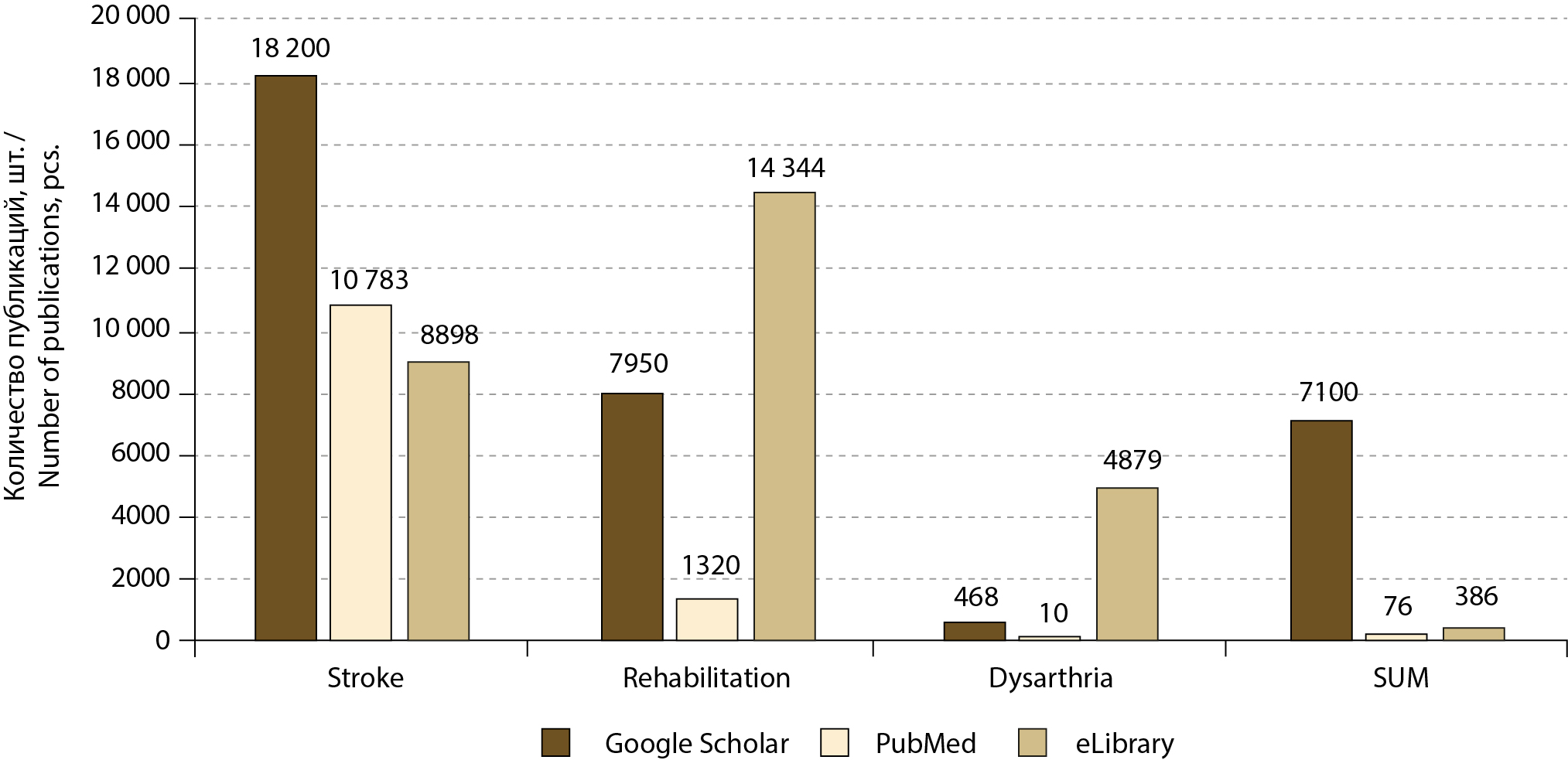 Как видно из рис. 1, инсульт сохраняет свои лидирующие позиции по количеству публикаций. Однако отечественная база данных eLibrary опережает зарубежные по количеству работ по теме «реабилитация», что говорит об активном развитии российской науки в данном направлении. В сумме по трем основным ключевым словам в базе данных GoogleScholar найдено максимальное количество работ (7100), при этом отмечался низкий уровень фильтрации статей, их повторы и трудности выявления основной тематики.
