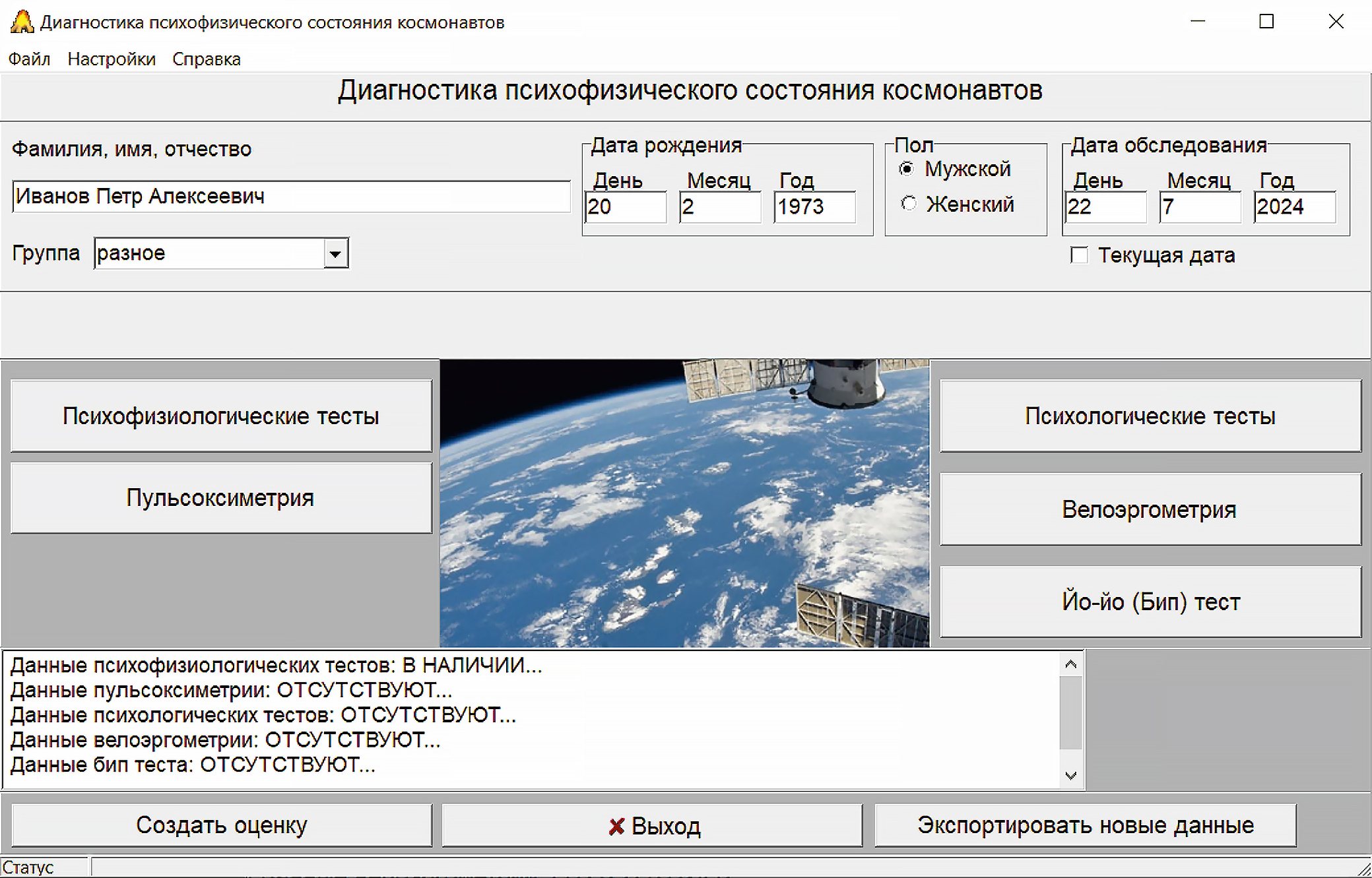 Рис. 1. Главное окно программы для ЭВМ. Диагностика психофизического состояния космонавтов
