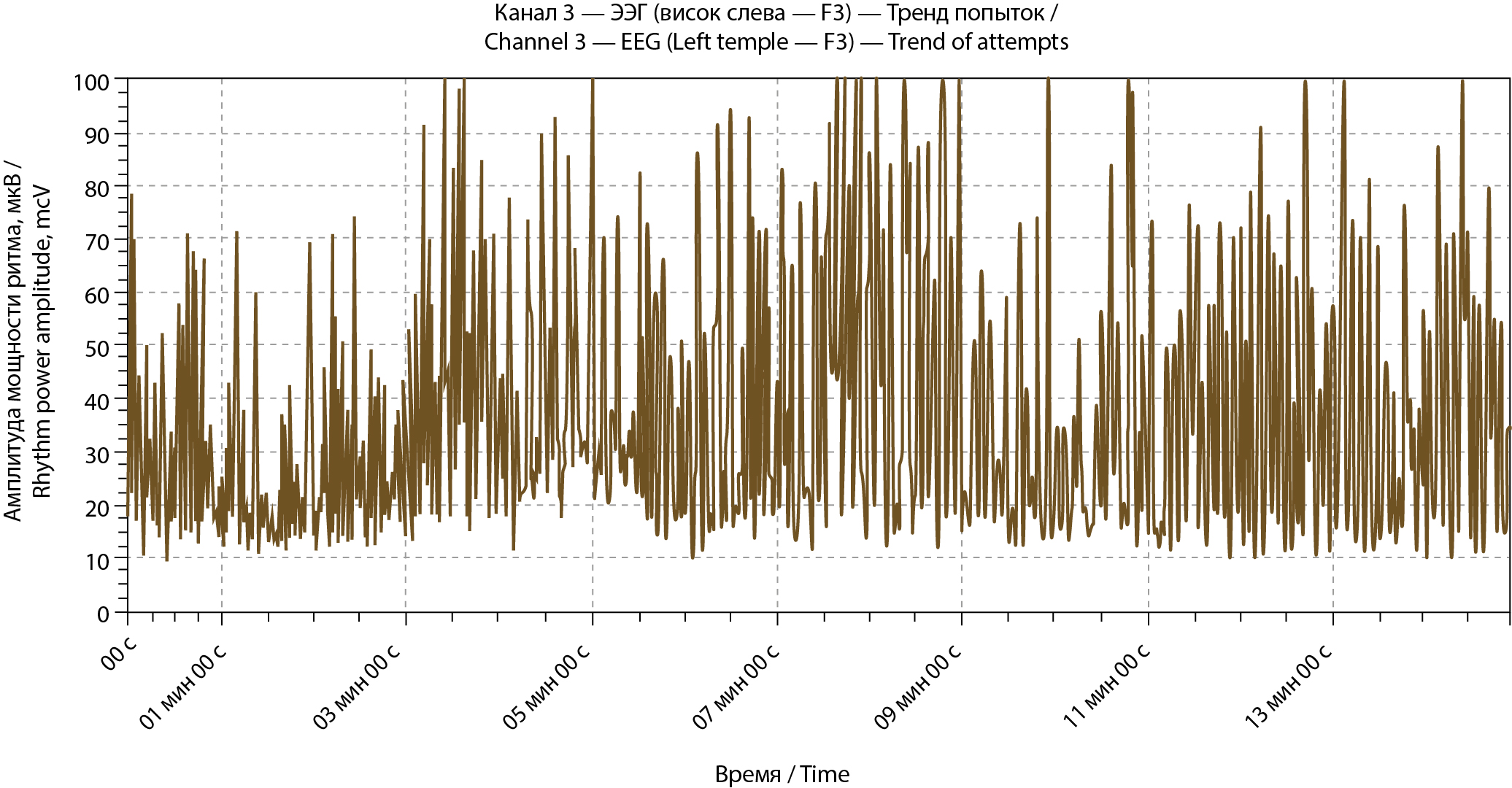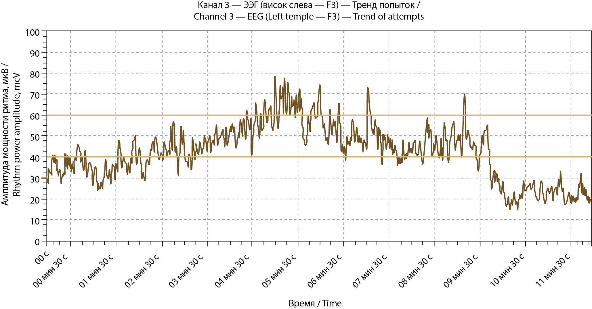 Рис. 3. Тренд попыток по каналу 3 ЭЭГ-сигнала (висок слева — F3) при завершении курса БОС-тренинга по β-ритму головного мозга