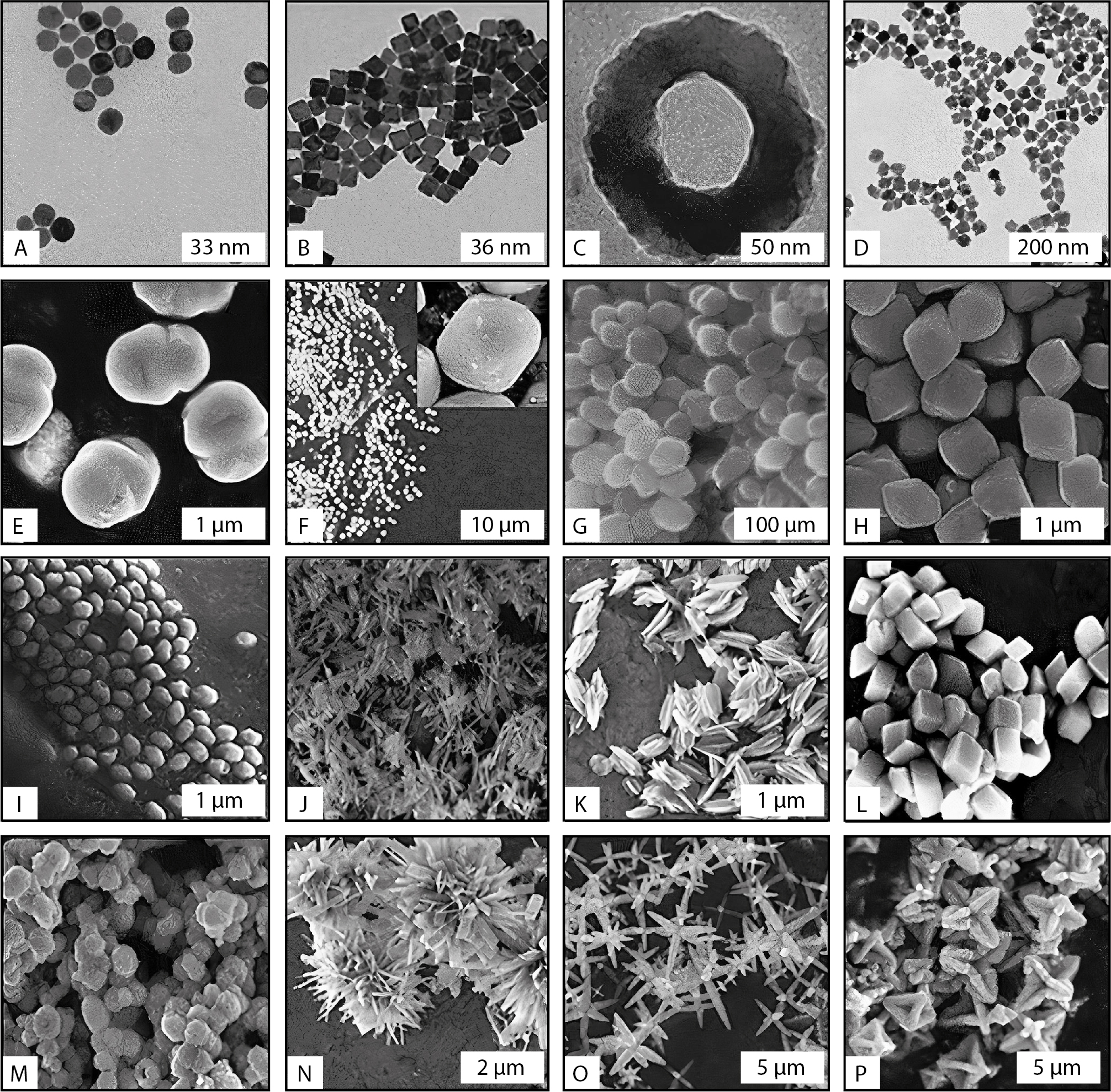 Рис. 1. Изображения МНЧ, полученные с использованием просвечивающей (A–D) и электронной сканирующей микроскопии (E–P): A — сферические частицы; B — кубические частицы; C — нанокольца; D — цветкообразные частицы; E — грибообразные частицы; F — кубообразные частицы; G — пластинчатые частицы; H — структуры ромбоэдрической формы; I — эллипсоидные 3D-структуры; J — наностержни; К — наношелуха; L — кубические; М — пористые сферы; N — сложноориентированные цветки; О — звездообразные; P — вогнутые октаэдры [29]