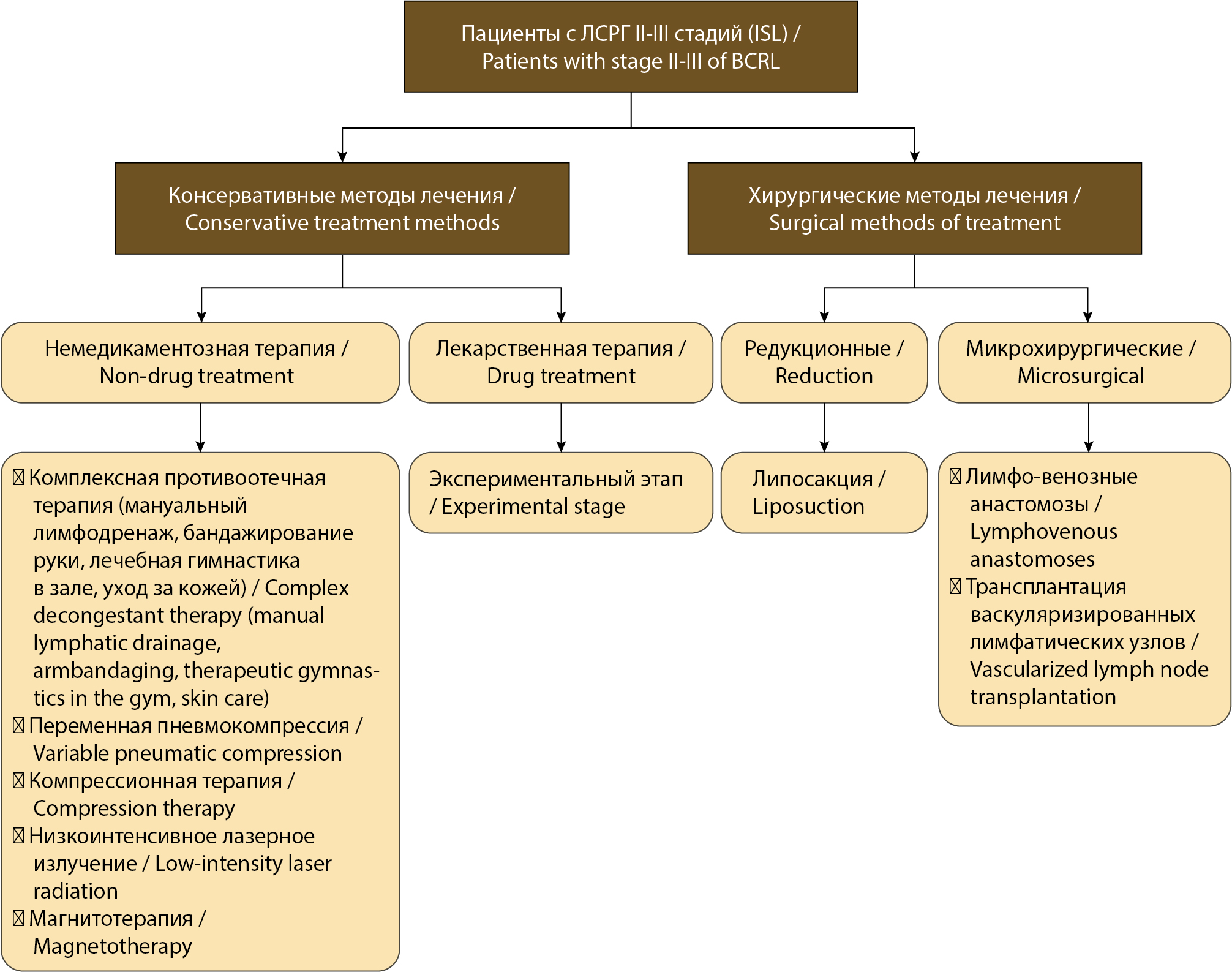 CONCLUSION. To reduce the risk of development and progression of BCRL, modern exercise therapy techniques should be used to increase physical activity in order to control body weight, and educational techniques for self-massage and self-application of compression bandages should be actively used. The “golden” standard for conservative treatment of BCRL remains CDT, which is based on MLD. At the same time, the wider use and development of new methods of hardware lymphatic drainage that imitate MLD, which is a highly resourceful and costly method of treatment for BCRL, is justified. To confirm the clinical effectiveness of improved hardware pneumocompression, additional RCTs assessing long-term treatment results are required.
