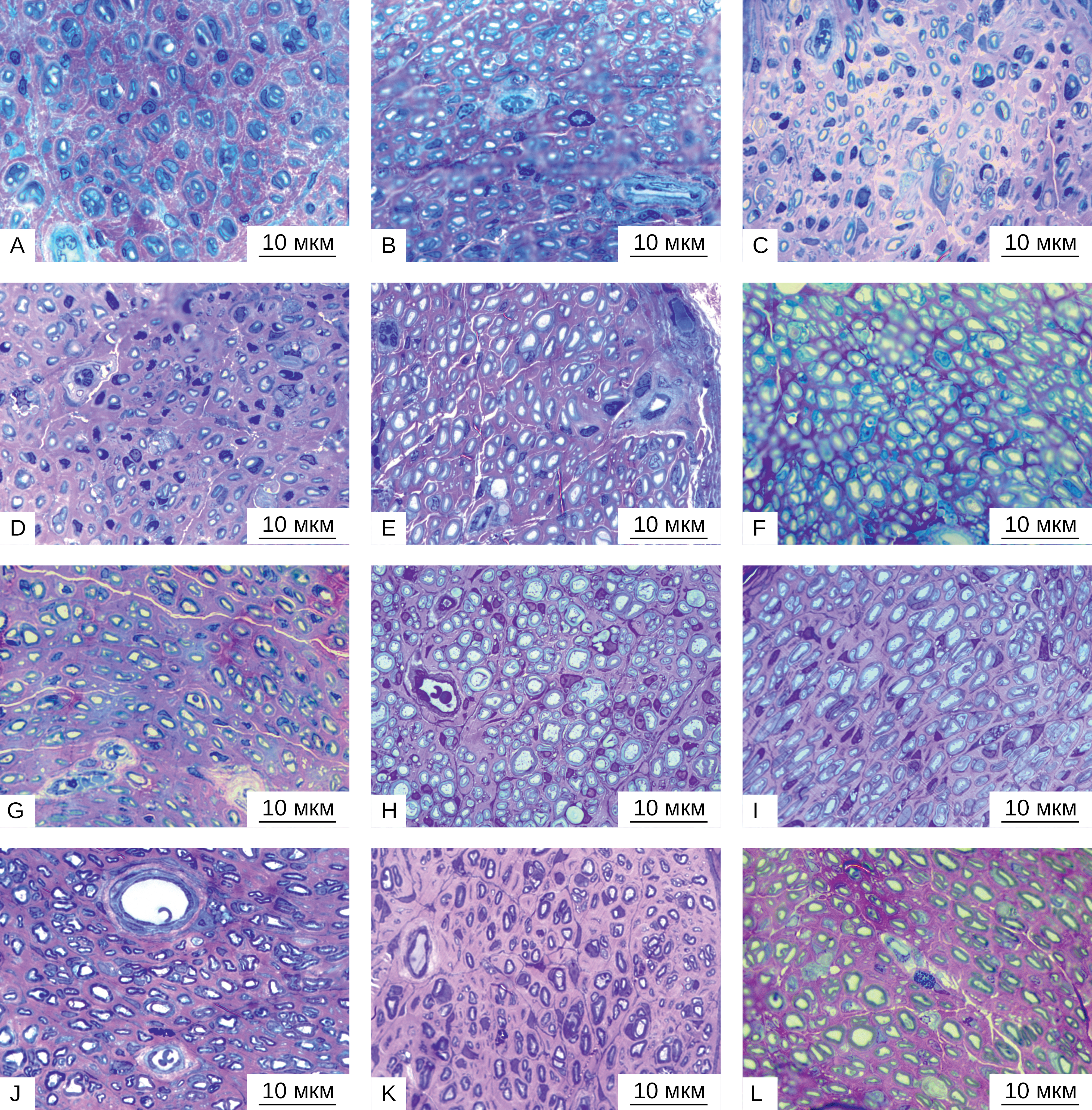 Рис. 1. Фрагменты поперечных полутонких срезов большеберцовых нервов крыс