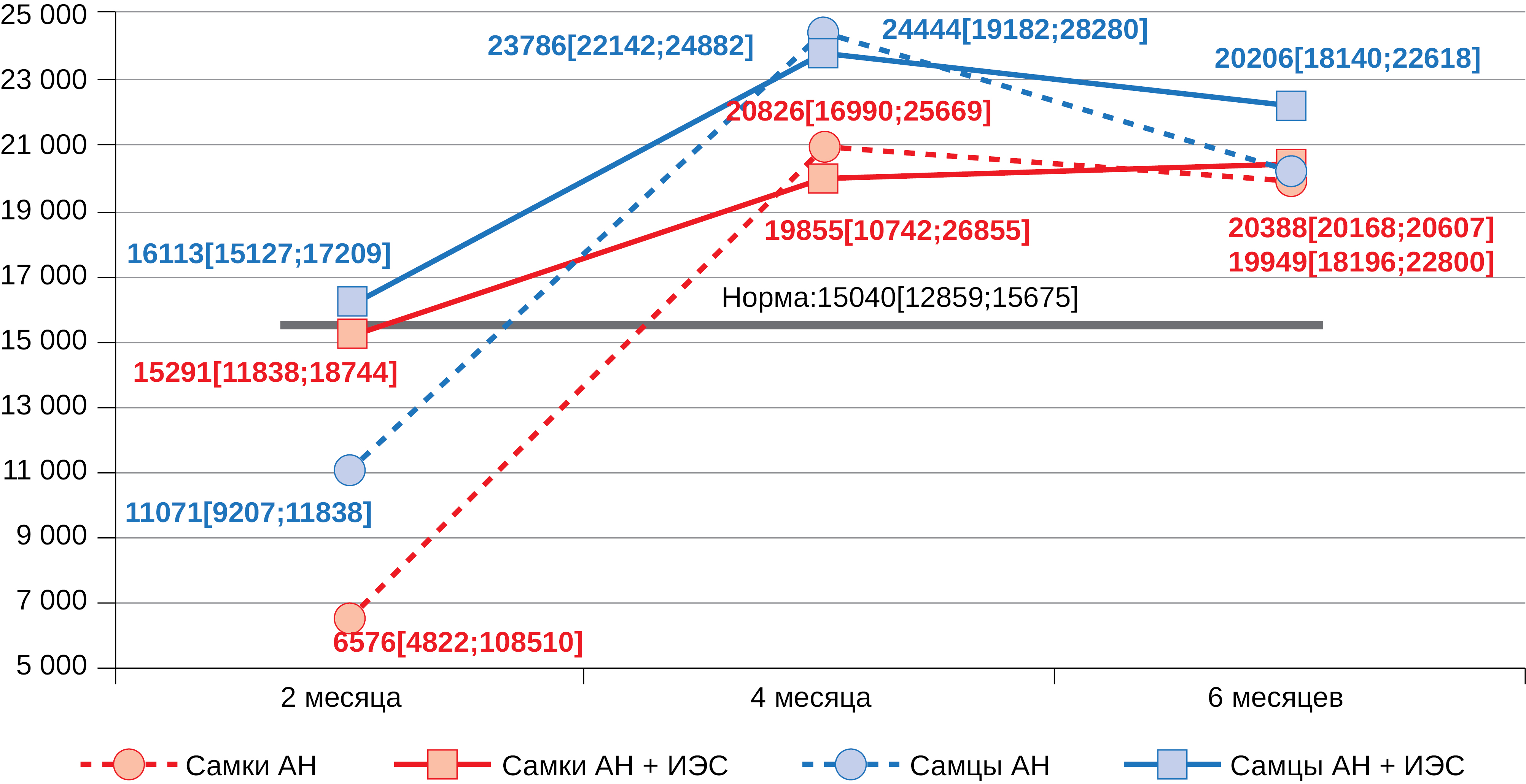 В серии АН + ИЭС крыс обоего пола наблюдается положительная динамика TFI, к 6 месяцам он повышается (см. рис. 4), что расценивается как положительная динамика. TFI к концу опыта в серии АН + ИЭС выше у самцов, значимость отличия от самок на уровне статистической тенденции (p = 0,0568).