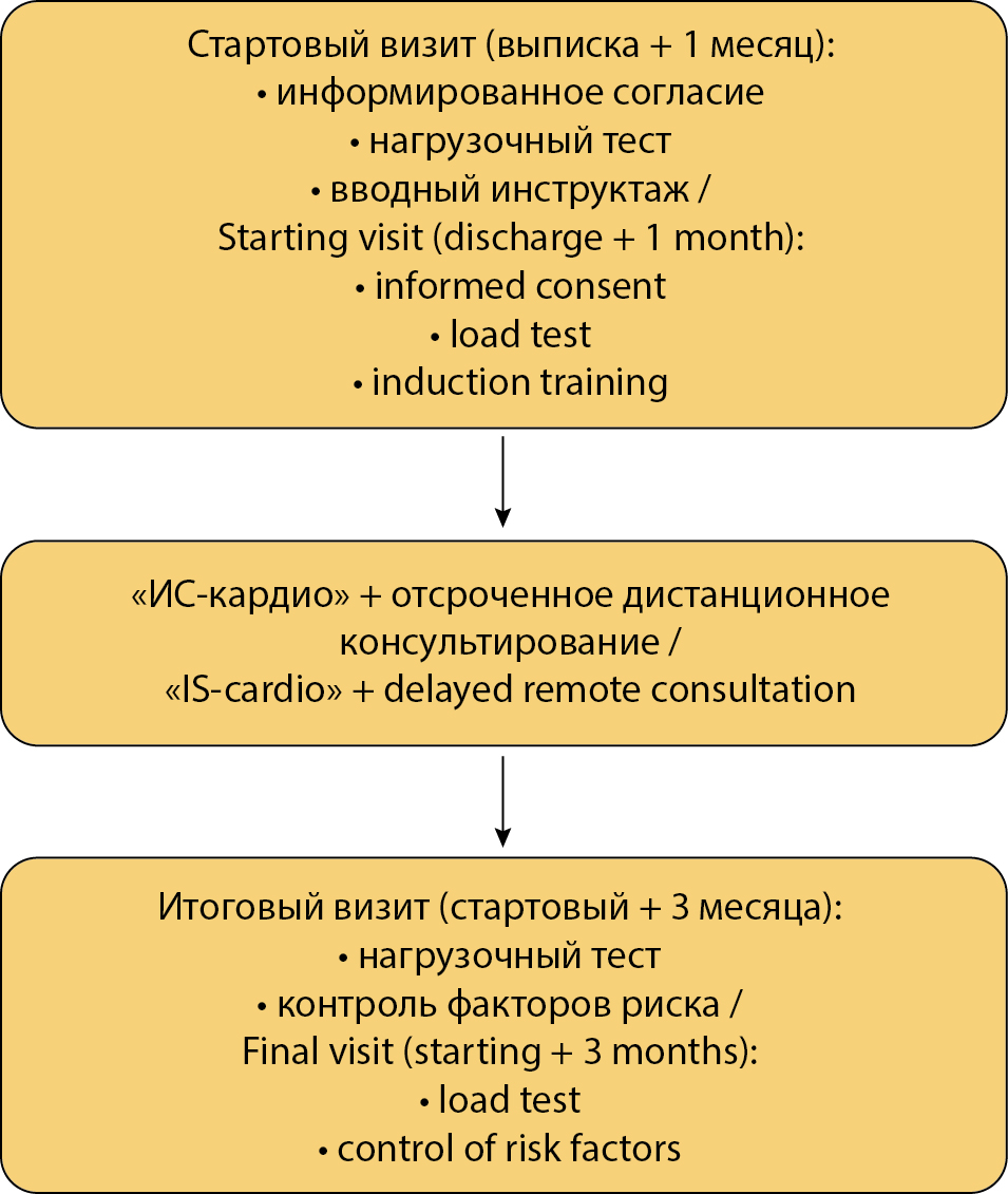 Для включения приглашались пациенты, выписанные из кардиологического стационара после острого коронарного синдрома с/без выполненным чрескожным коронарным вмешательством, или пациенты городских амбулаторных учреждений со стабильной стенокардией напряжения I–III функционального класса по Канадской классификации и/или артериальной гипертензией 1–3-й степени), выписанные из стационара в течение предшествующего месяца, не имеющие противопоказаний к физической КР [1], с наличием мобильного устройства (смартфона или планшета). В исследование не включались пациенты после больших кардиохирургических операций, с клапанными пороками сердца, хронической сердечной недостаточностью III–IV функционального класса по NYHA, имплантированным электрокардиостимулятором, когнитивной дисфункцией.