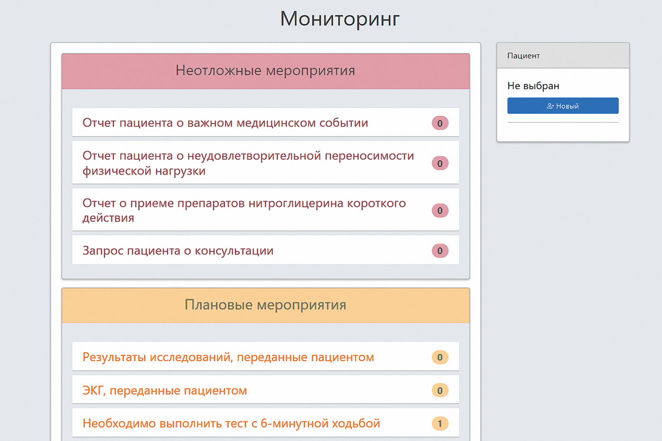 В качестве дистанционного вмешательства использовалась 12-недельная программа ФТ с интенсивностью 55 %, частотой 3 сеанса/неделю, продолжительностью 90–300 мин/неделю и допустимым уровнем индивидуальной переносимости физической нагрузки 8–13 баллов по шкале Борга 6–20. Исходная программа ФТ (стартовый уровень ДКР) формировалась в соответствии с алгоритмом клинических рекомендаций [1], реализованным в ТМП «ИС-кардио»; параметры ФТ для каждого последующего 2-недельного уровня ДКР определялись компьютеризированным алгоритмом на основе данных телеметрии и информации, переданной через «Личный кабинет пациента». Деятельность пациента отображалась в «Личном кабинете врача» в формате трех групп индикаторов «Неотложные мероприятия», «Плановые мероприятия» и «Уведомления системы» (рис. 4).