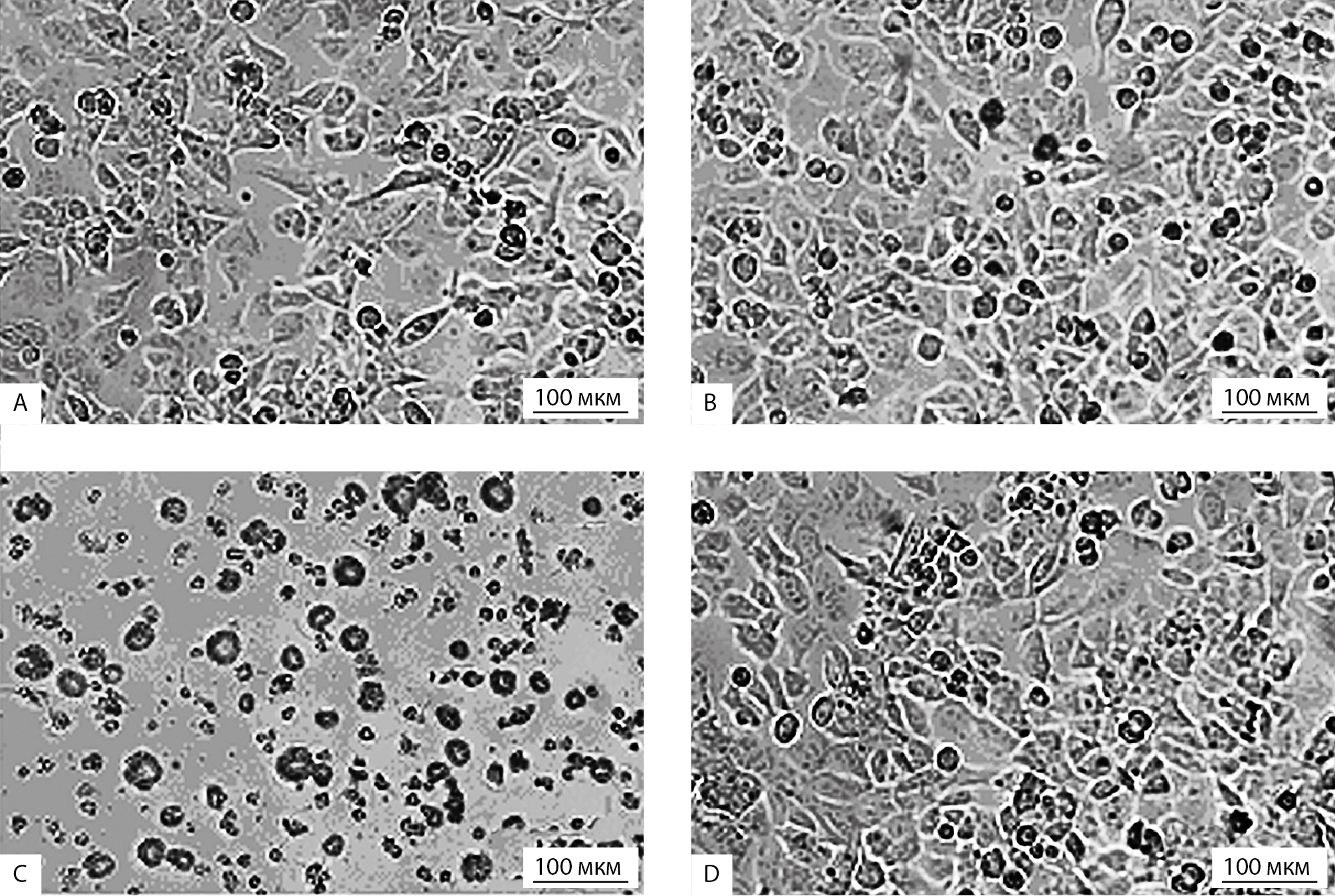Примечание: (A) интактная питательная среда; (B) среда, содержащая коллагеновый гидрогель; (C) индометацин; (D) смесь коллагенового гидрогеля с индометацином. Световая микроскопия, ×100.