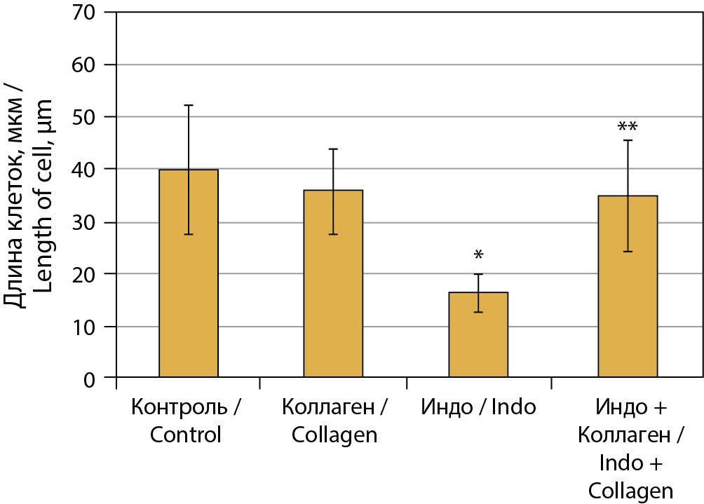 Такая же картина наблюдается при инкубации энтероцитов HuTu-80 с коллагеновым гидрогелем (рис. 1B, рис. 2). При инкубации энтероцитов совместно с индометацином процесс трансформации клеток замедляется, более 90 % клеток остаются сферической формы, диаметр клеток составляет 16 ± 4 мкм (рис. 1C, рис. 2). В то же время при культивировании клеток в среде, содержащей как индометацин, так и коллагеновый гидрогель, способность клеток к трансформации и росту сохраняется: большинство клеток приобретают веретеновидную форму (рис. 1D), длина тела клеток становится сопоставимой с контрольными значениями и составляет 35 ± 10 мкм (рис. 2).