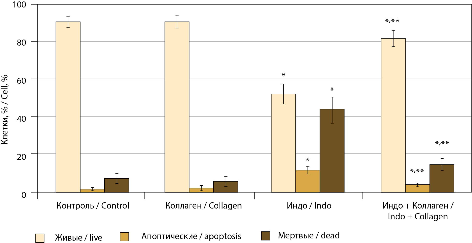 Коллагеновый гидрогель предотвращает гибель клеток, вызванную индометацином, и снижает количество апоптических клеток в популяции. В контроле при культивировании клеток HuTu-80 в стандартных условиях количество живых, апоптических и мертвых клеток в популяции составляет 91 ± 3, 1,4 ± 0,3 и 7 ± 1 % соответственно (рис. 3). Подобная картина наблюдается при инкубации энтероцитов с коллагеновым гидрогелем (рис. 3). Совместная инкубация энтероцитов с индометацином взывает гибель 50 % клеток и многократное увеличение количества апоптических клеток (рис. 3). Внесение коллагенового гидрогеля в среду с индометацином ингибирует гибель клеток, что выражается в снижении количества как мертвых клеток, так и клеток на стадии апоптоза (рис. 3).