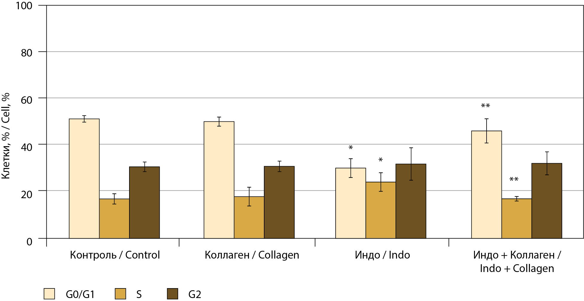 Установлено, что коллагеновый гидрогель предотвращает патологические изменения в клеточном цикле, вызванные индометацином. Правильное развитие клеточного цикла от G1-фазы до M-фазы гарантирует, что каждая из двух дочерних клеток получит идентичные хромосомы от родительской клетки. В контроле при инкубации в стандартной питательной среде более 50 % клеток находится в фазе роста G1, в синтетической фазе (S-фаза, фаза синтеза ДНК) и G2-фазе (предмитотический период) находятся 17 ± 2 и 31 ± 2 % клеток соответственно (рис. 4). Полученные результаты согласуются с данными литературы [27] и указывают на то, что исследуемая популяция клеток имеет нормальное распределение фаз клеточного цикла.
