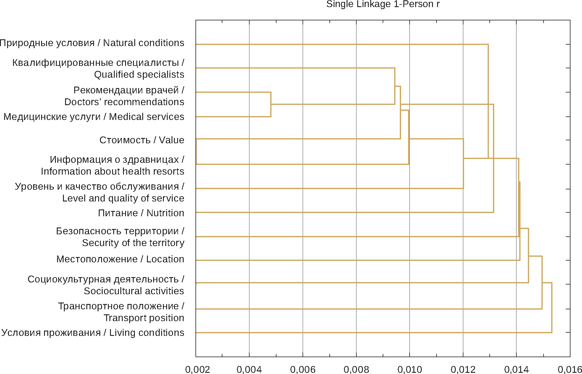 При обработке результатов анкетирования по выявлению факторов, оказывающих влияние на выбор здравницы населением, был применен кластерный анализ, как многомерная статистическая процедура, выполняющая сбор данных, содержащих информацию о выборке объектов, и затем упорядочивающая объекты в сравнительно однородные группы (рис. 1). Метрика расстояния между точками, т. е. меры сходства: 1 − коэффициент Пирсона. Метод одинарного соединения.