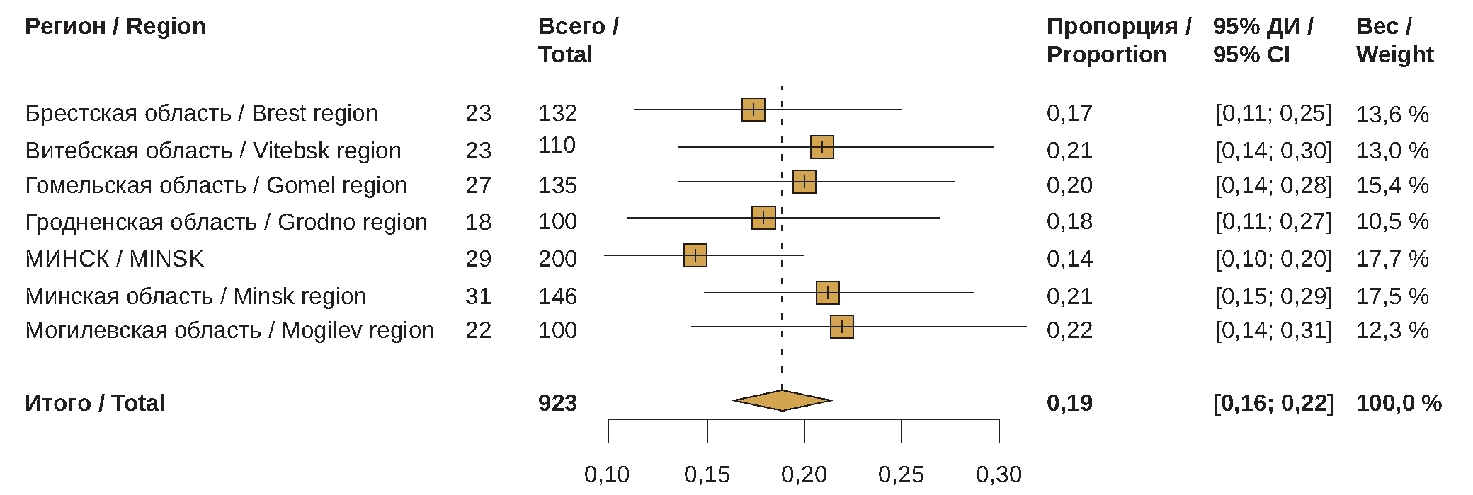 Репрезентативность выборки была обеспечена за счет расчета необходимого числа респондентов с учетом количества населения областей Республики Беларусь. Расчет количества респондентов проводился с учетом мощности исследования на уровне (1 – β) = 80 %, предельной ошибки не более 5 %, и уровнем ошибки I рода α = 0,05 с учетом того, что случайный ответ мог быть зарегистрирован с вероятностью p = 0,5. При расчете учитывалось, что часть ответов респондентов может быть исключена из исследования (если анкета заполнена менее чем наполовину), введен добавочный коэффициент в 20 %, таким образом, окончательное число респондентов определено как 784 × 1,2 = 941. При обработке полученных анкет недействительными признали 18 анкет, что составило менее 2 %, таким образом, в исследовании приняли участие 923 респондента.